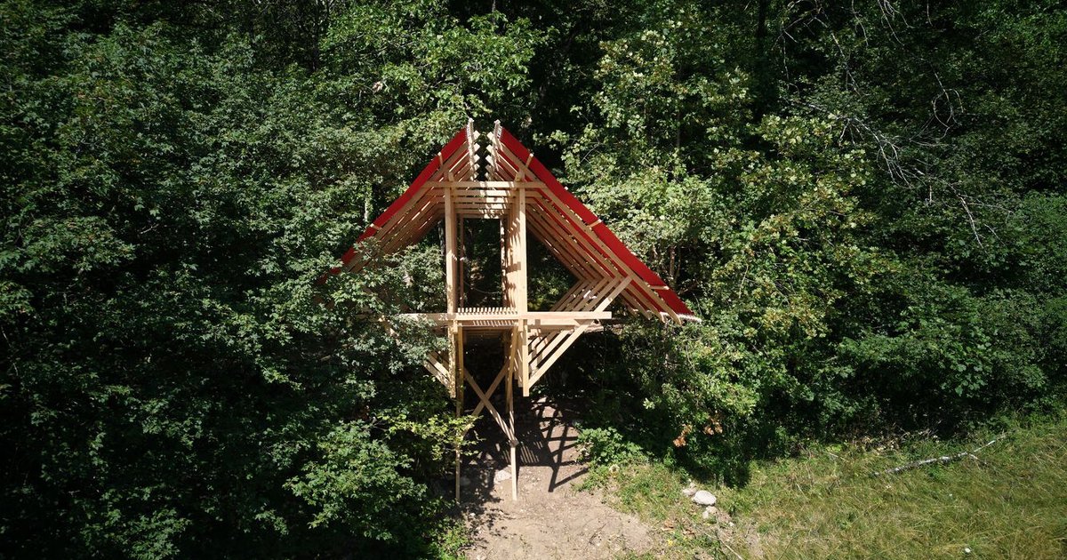 The design features a minimal pod suspended above a forested trail. Cantilevered over the landscape, it creates a shady pause for the passing flâneur. With no walls and a single sloped roof, the structure is deliberately open to the elements, inviting visitors to experience the filtered light, the cool alpine air, and uninterrupted views of the nearby lake.
