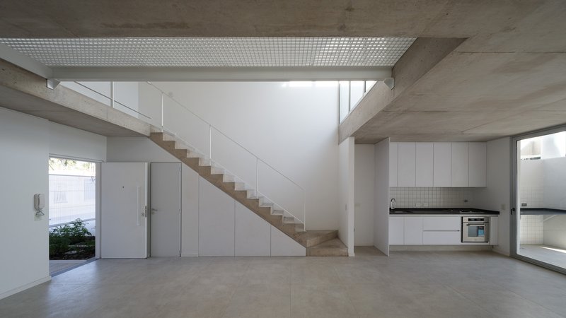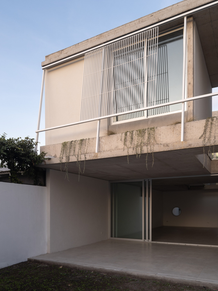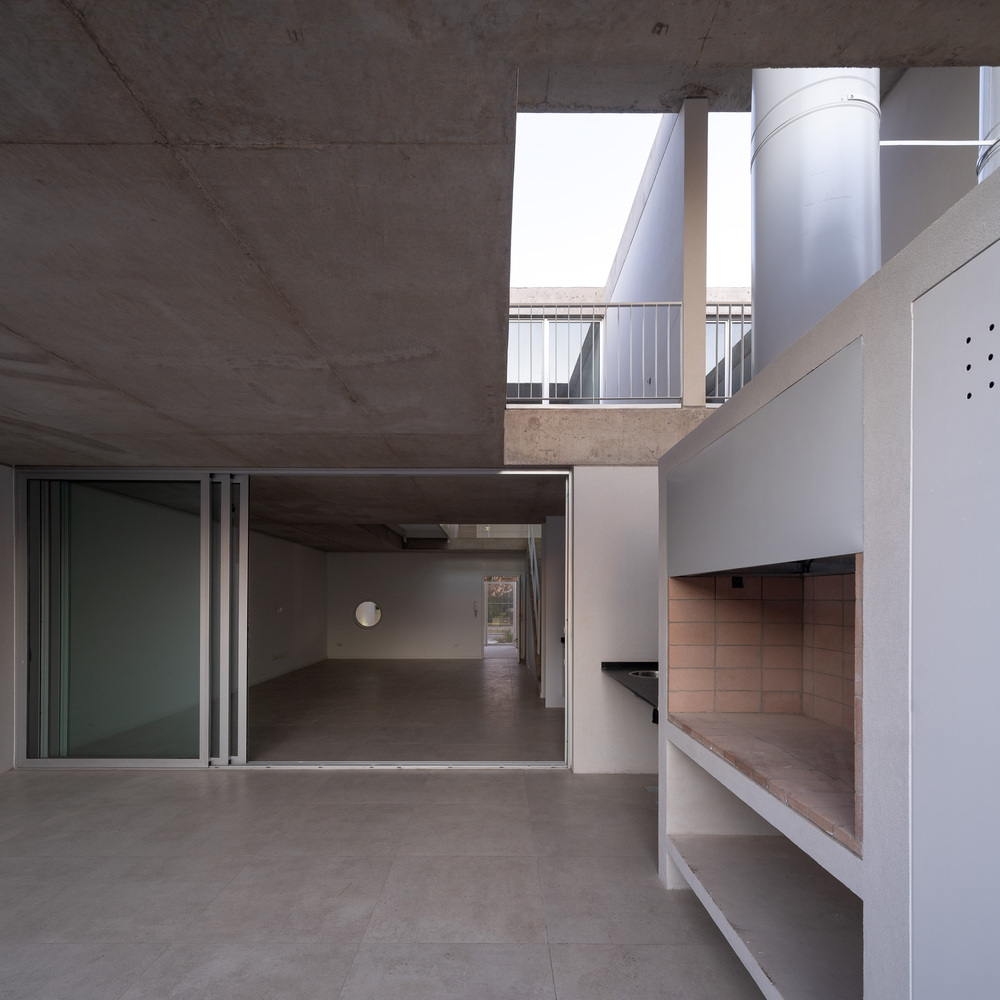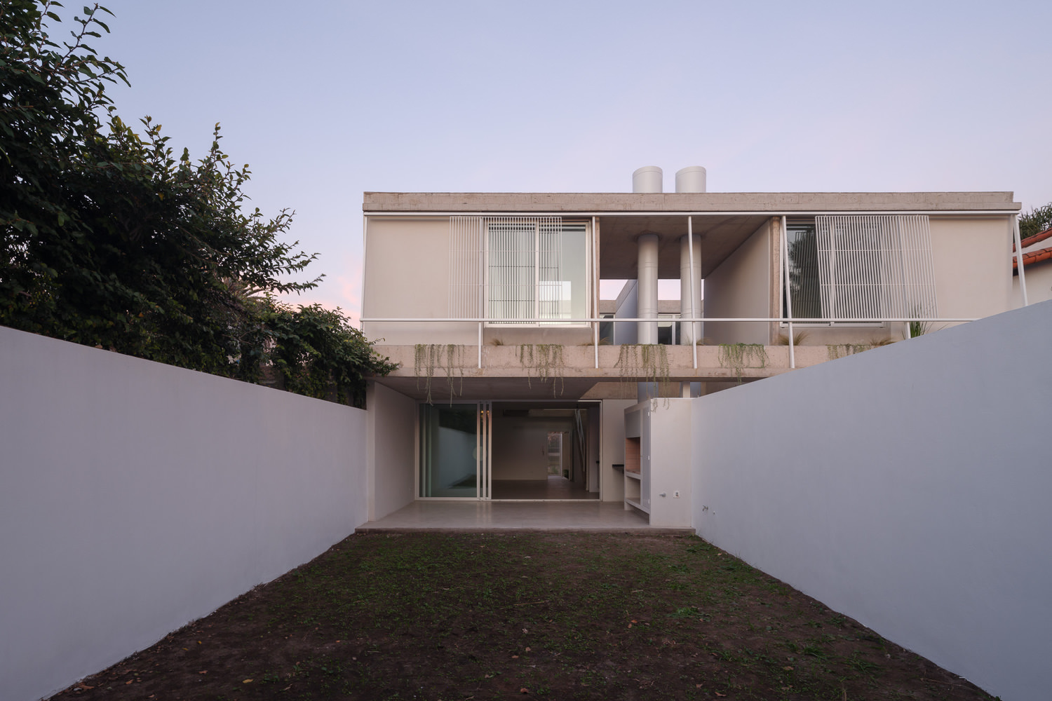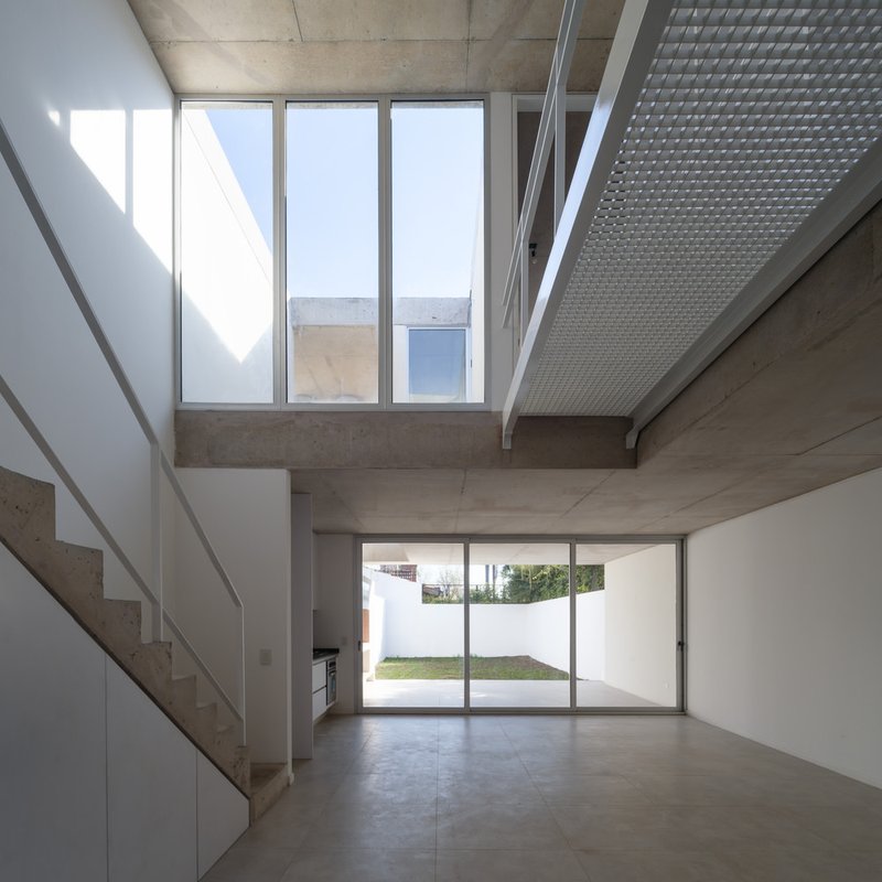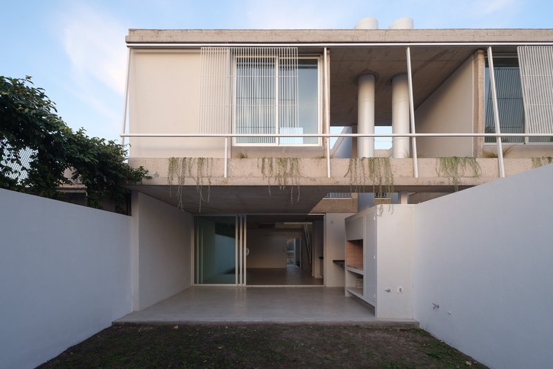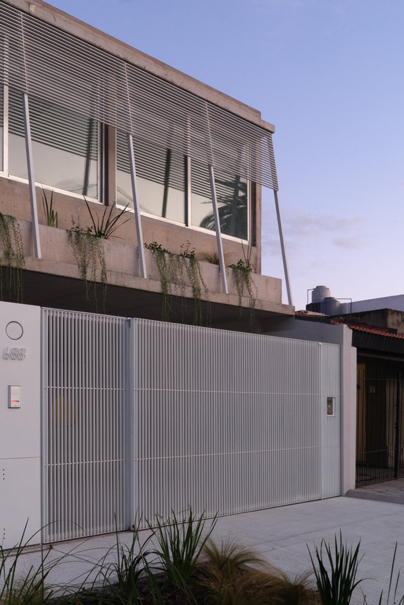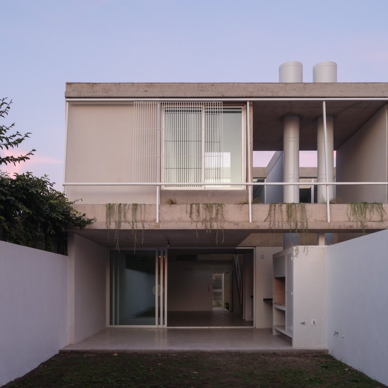 Paysandú Residences, designed by bakro-mayorano, consists of two mirrored contemporary homes situated on a compact 12x30 meter lot in a residential neighborhood of Ituzaingó. The project responds thoughtfully to its surroundings, following a clear pattern of transition from the public street to private interiors. The progression—from sidewalk to fence, flower beds, patio, and door—creates a natural flow between exterior and interior spaces.