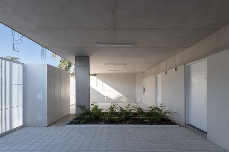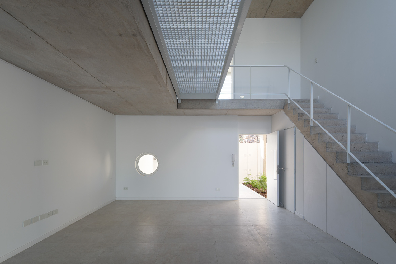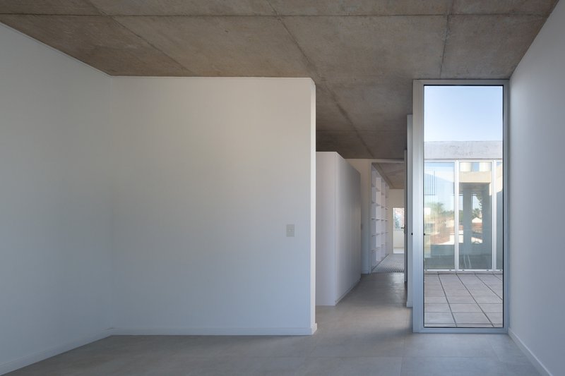 The material palette reinforces the spatial concept. Exposed reinforced concrete slabs flow uninterrupted, emphasizing structural clarity, while vertical surfaces are finished in white paint or glazing to balance solidity and transparency.