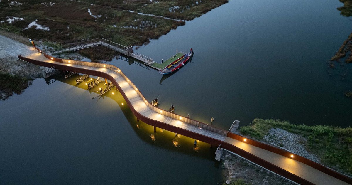 In the heart of Vagos, Aveiro, Portugal, the new pedestrian and cycling bridge designed by Rómulo Neto Arquitetos stands as a contemporary response to a deeply historical site. Commissioned by the local government, the project reimagines the crossing between the banks of Vagos and Sousa, where the ruins of the original bridge—dating back to June 27, 1855—still linger. This modern intervention not only reconnects the two banks but also commemorates the old structure, blending design innovation with historical sensitivity.