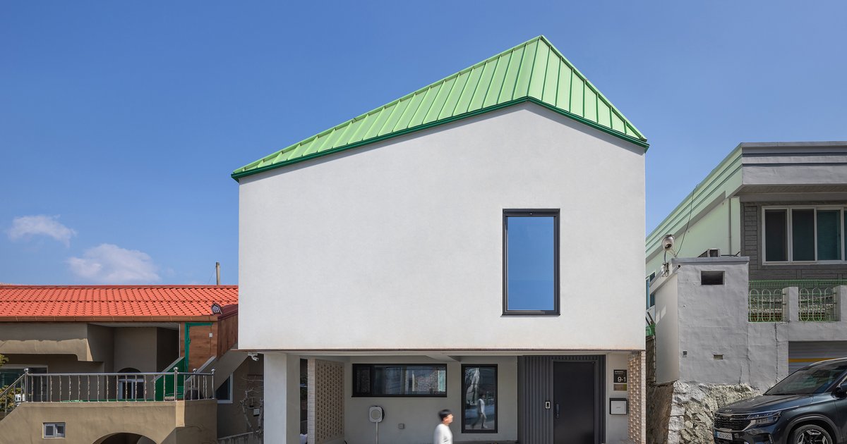 The result is a delightful transformation. Once a raw, exposed-concrete office, the building now presents itself as a charming volume with a white stucco exterior and a yellowish-green sloping roof—earning the playful nickname Pencil House, resembling a pencil that has been sharpened down with use.