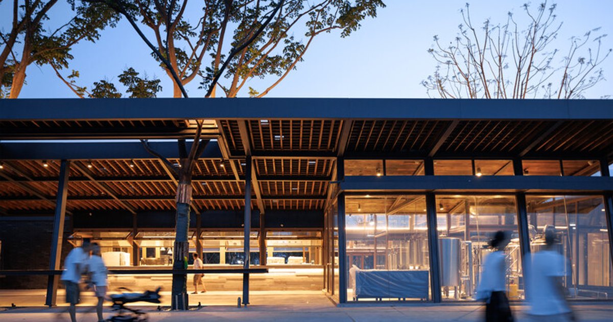 Large glass façades maximize visual connection to the park and courtyards, while folding doors allow the interior to merge seamlessly with exterior platforms.