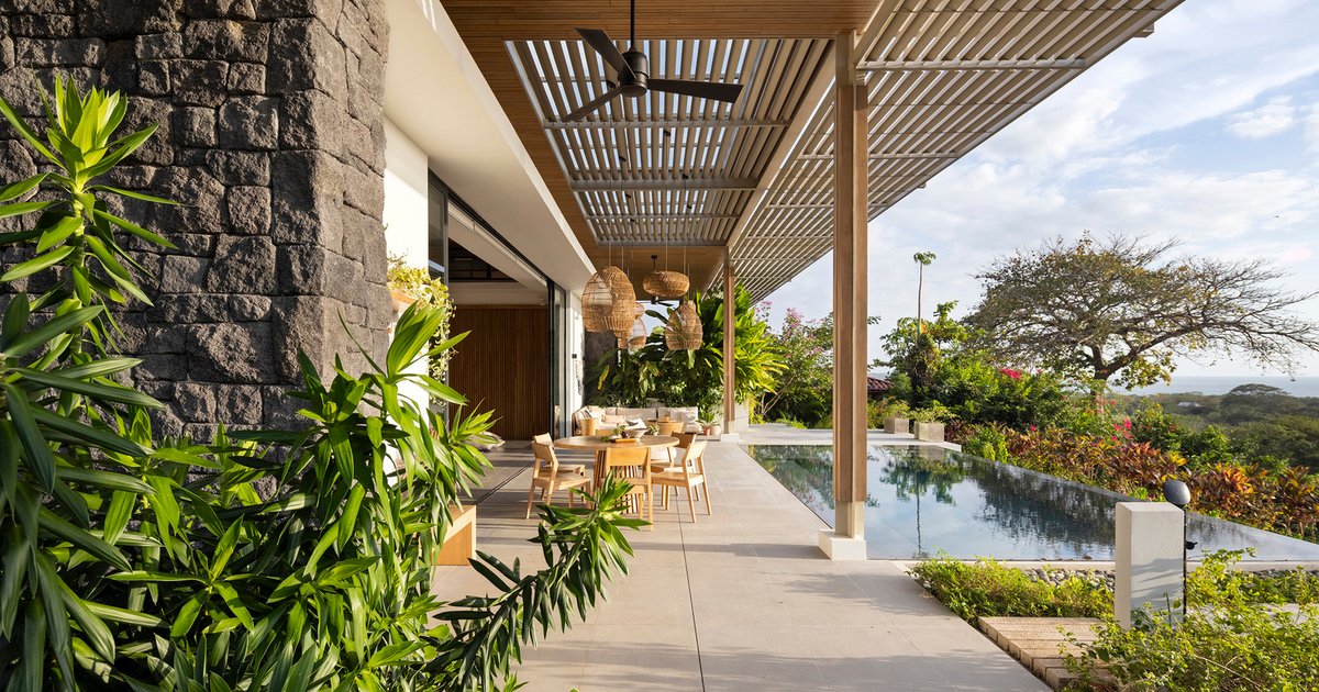 The article discusses Pergola House by Studio Saxe, focusing on its eco-friendly design and seamless integration with the Costa Rican landscape.