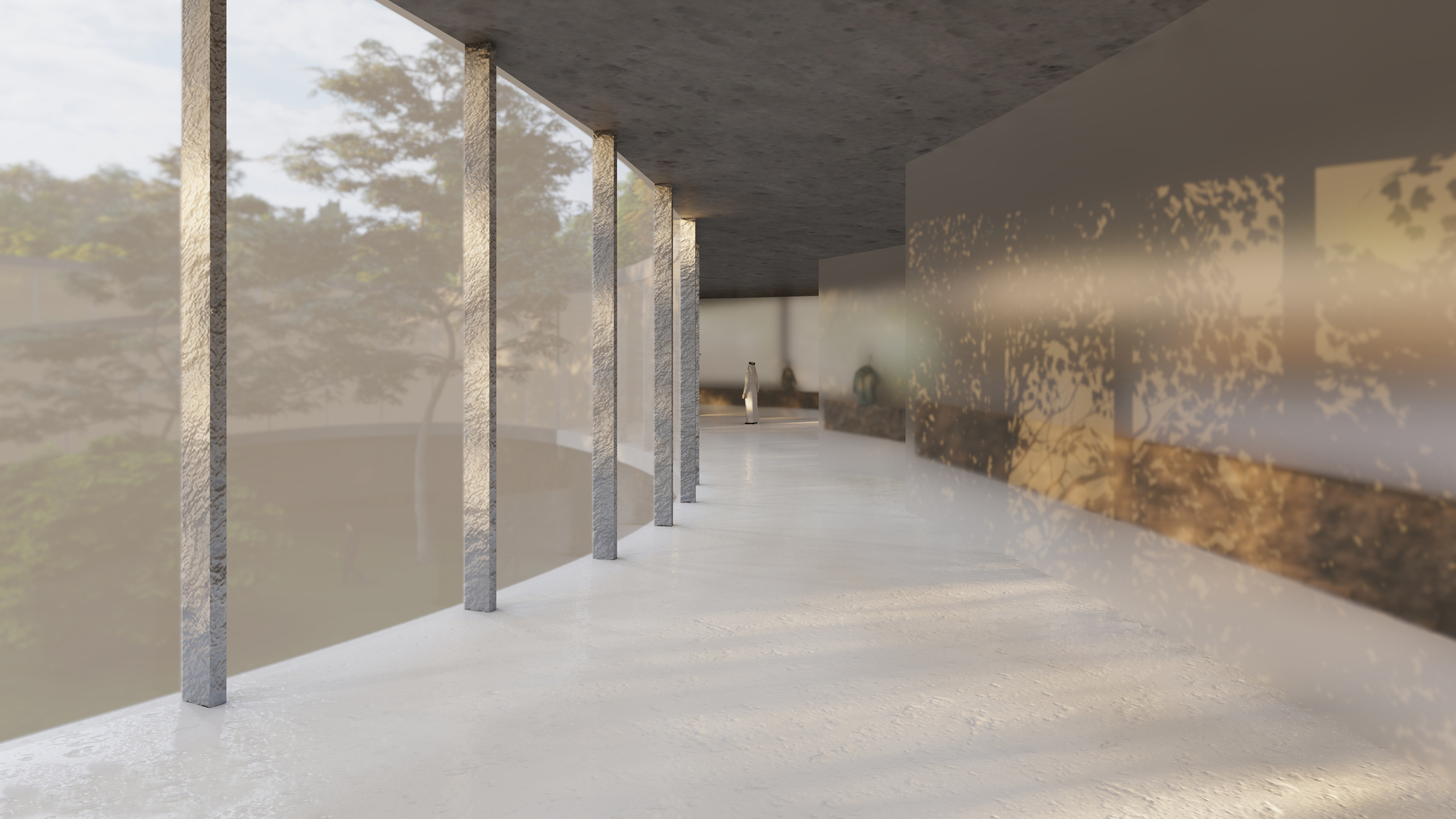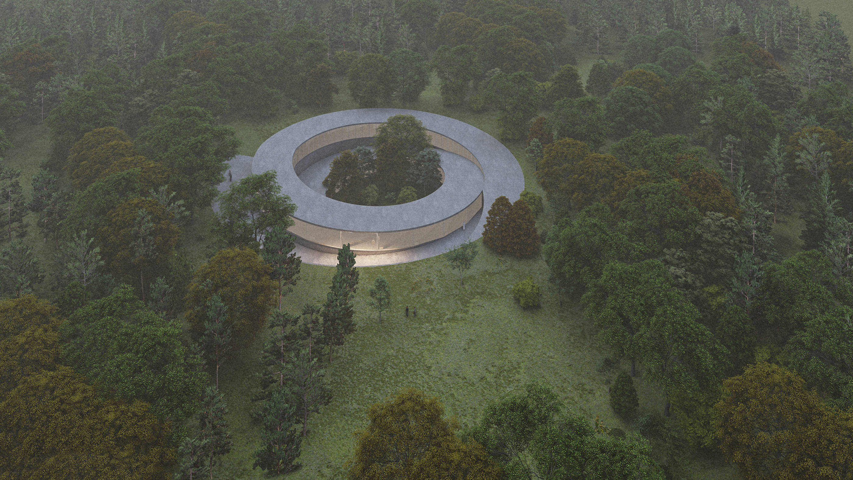 The central plan indicates equality and encourages to meet there and share with other people. The sloped surface, leading through the whole building, guides to contemplation spots which are equipped just with a minimalist bench. The space is open, which not only gives it an opportunity to transform but also creates an atmosphere of unity and inclusivity.