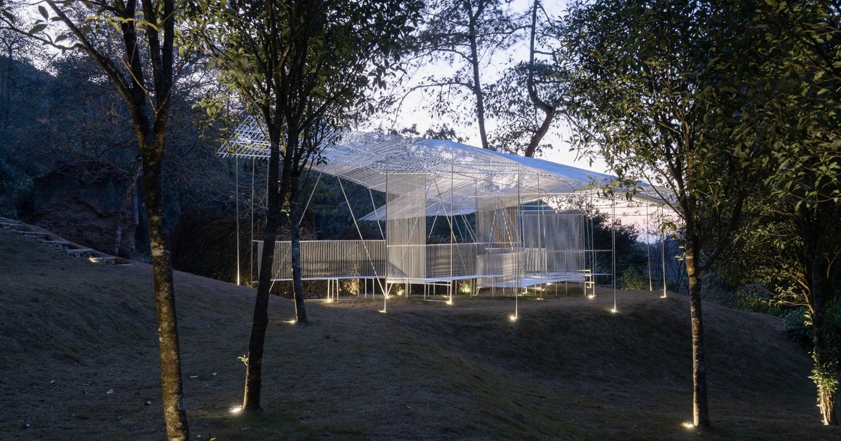 In this example of pavilion architecture in nature, the gesture is not to conquer the land but to caress it. The pavilion’s design carefully avoids interference with ancient trees, allowing the forest to remain the main character in the spatial narrative. The steel rods create a minimal footprint and allow light and air to pass freely. The tea bar and viewing platform on the southern edge act as subtle anchors, while the eastern side rises lightly, adding to the sensation of suspension.