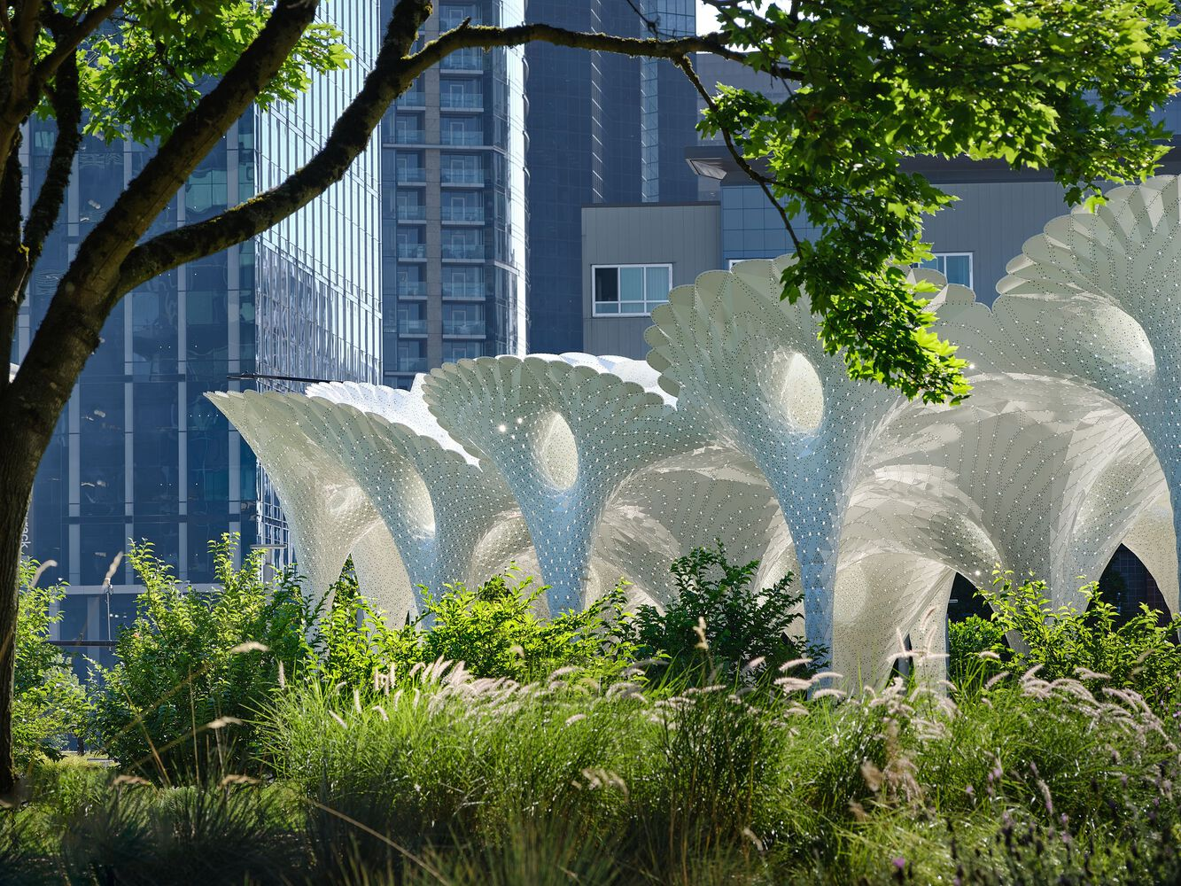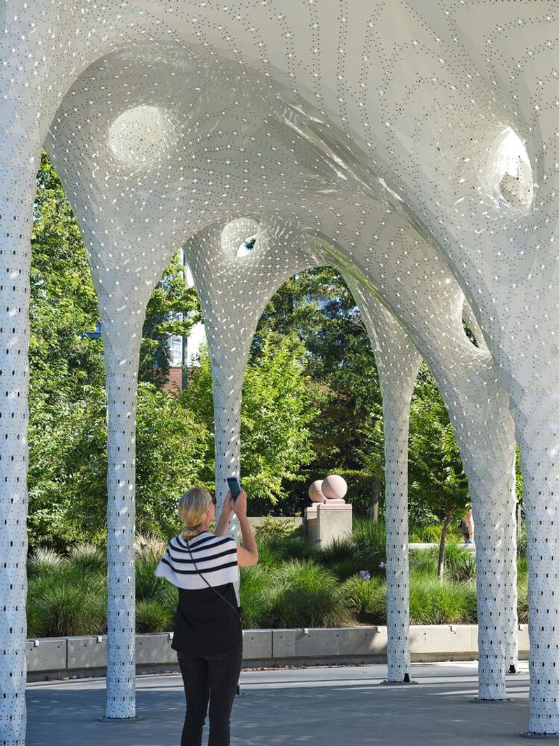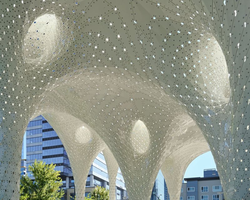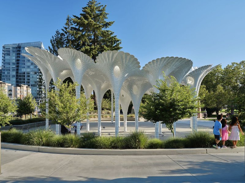 The Piloti Installation, designed by MARC FORNES / THEVERYMANY, stands as a remarkable fusion of architectural innovation and sculptural elegance in Bellevue, Washington. Commissioned by the City of Bellevue, this ultra-thin, self-supporting aluminum shell structure rises as an iconic gateway at the entrance of Downtown Park, inviting visitors into the green expanse beyond while establishing a striking urban landmark.