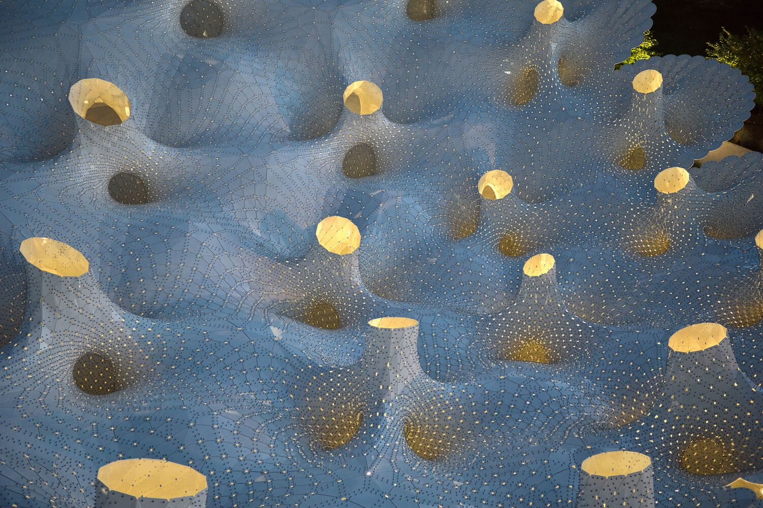 Rising 7.2 meters tall, Piloti is composed of 6,665 unique aluminum components meticulously connected with 180,900 rivets, forming a singular, all-encompassing rotunda. The structure’s design draws inspiration from the umbrella—a motif reimagined through contemporary parametric geometry. Each umbrella-like module is delicately elevated on slender columns, appearing to float and defy gravity, creating a sense of weightlessness and ethereal presence.