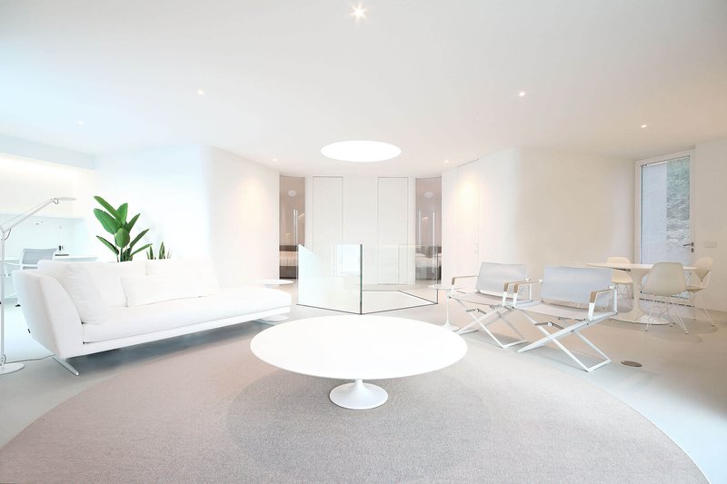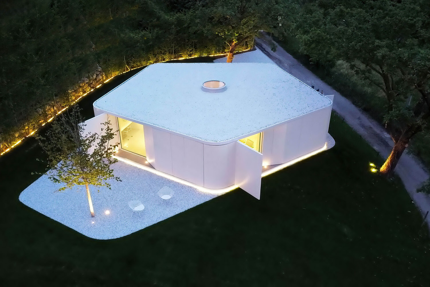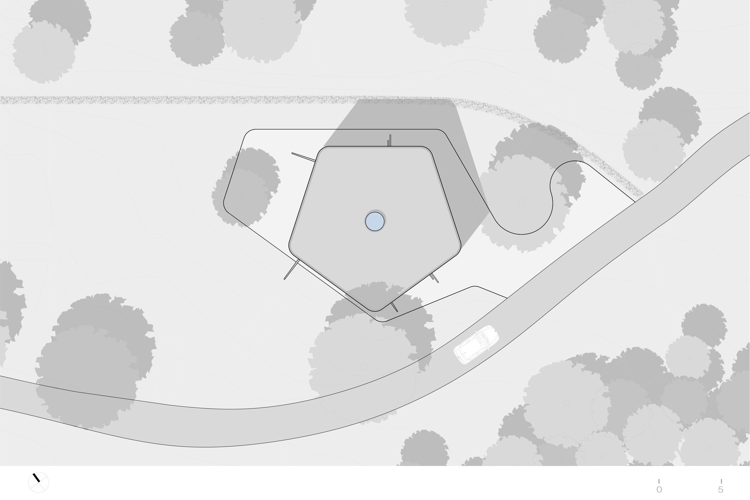 The home’s pentagon shape is not a stylistic whim, but the outcome of topographical constraints and careful volumetric study. At the heart of the single-story pavilion is a circular skylight above the central staircase — a functional and symbolic “center of gravity” that eliminates corridors, allowing every space to connect fluidly.