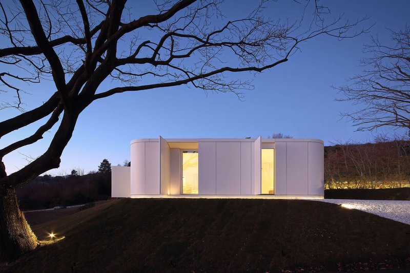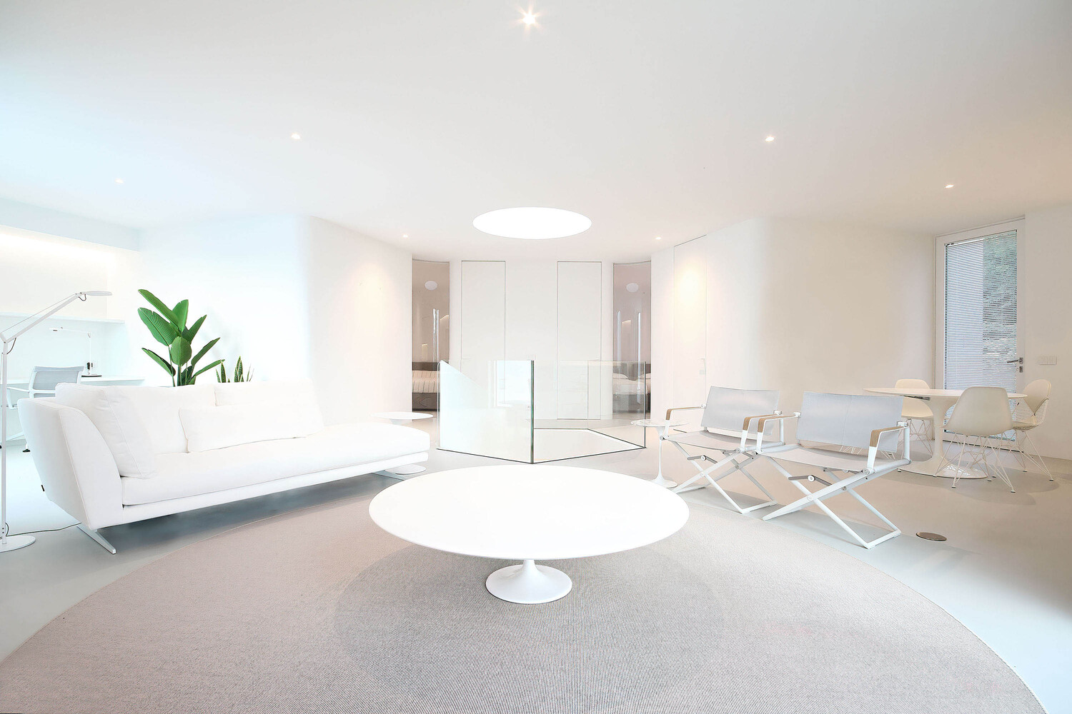 Inside, the palette is minimal and unified — white concrete floors, plastered walls, and monochrome furnishings enhance the sense of purity and brightness. The rounded building edges reinforce the pavilion’s flowing geometry, giving the structure its “pinwheel” identity.
