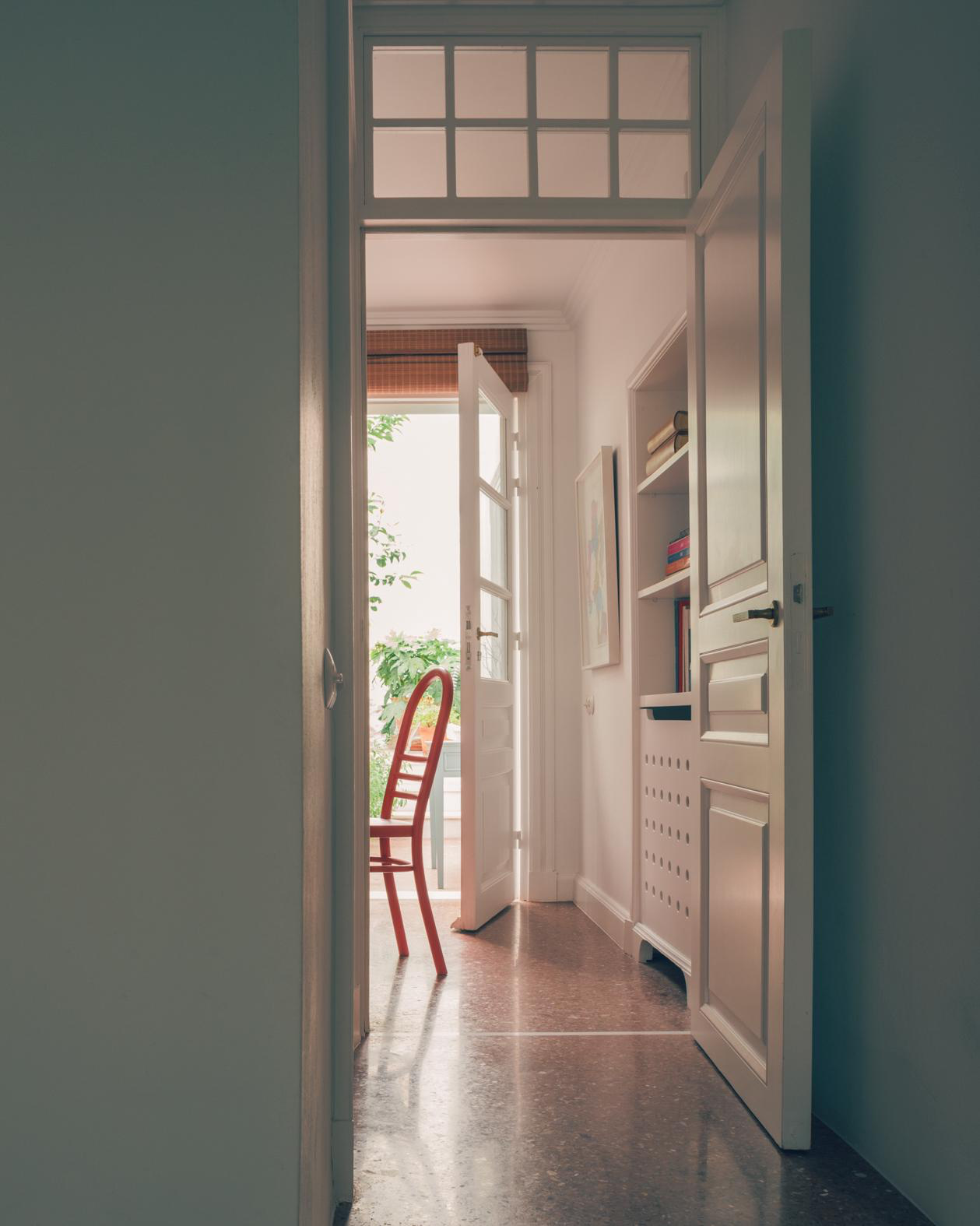 Throughout the house, original features were carefully preserved and refined rather than replaced. Wrought-iron exterior elements, wooden panelled doors, and marble jambs were retained and repainted in neutral tones, unifying the interior and exterior language while respecting the building’s historic fabric.