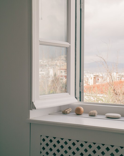 A rooftop terrace crowns the house, offering sweeping views across the rooftops of Athens toward the Acropolis. This elevated vantage point reinforces the building’s relationship to the city, reminding occupants that the house is not an isolated retreat but part of a living, historical continuum.
