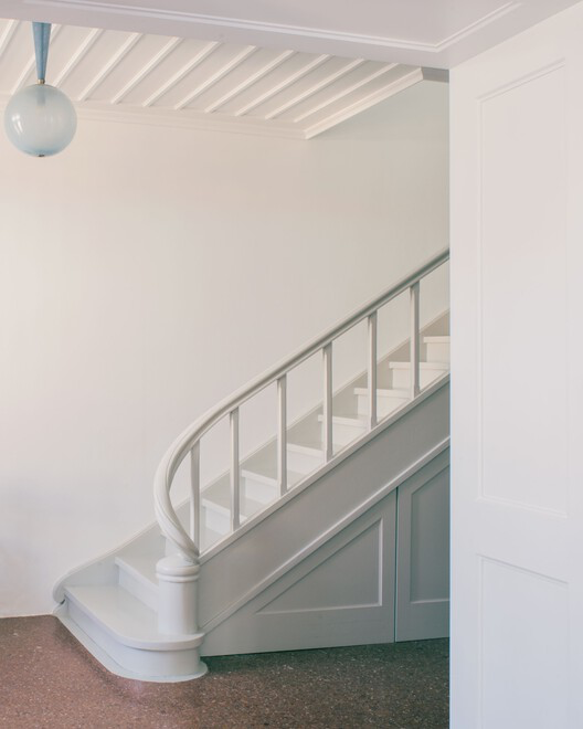 Working within the constraints of preservation regulations, the architects sought to strip back excess and re-establish a dialogue between the house and the city around it. The goal was to introduce calm, lightness, and cohesion while respecting the integrity of the listed structure—an approach that favours precision over spectacle.