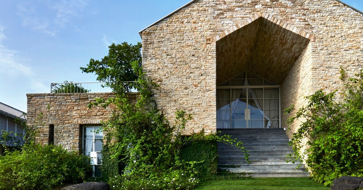 The home’s defining feature is its twin linear pavilions, staggered across the site to maximize both privacy and panoramic views. These white Dhrangadhra limestone-clad structures, paired with painted timber shutters and deeply recessed steel-framed windows, exude a plantation-style elegance that remains timeless.