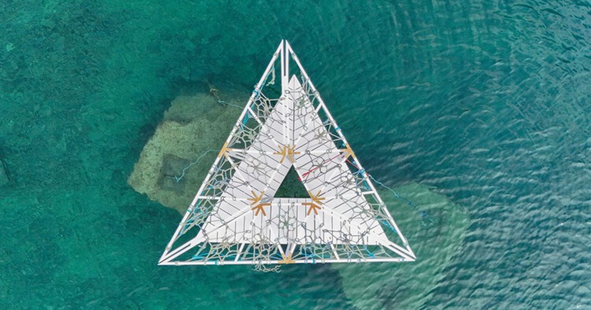 A floating triangular pavilion in Rijeka, built with reused materials, creating a serene communal space connecting sea, city, and visitors.