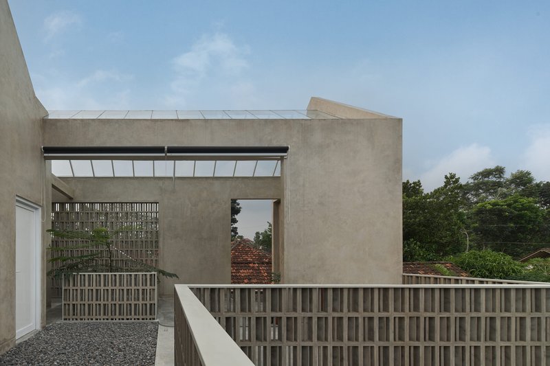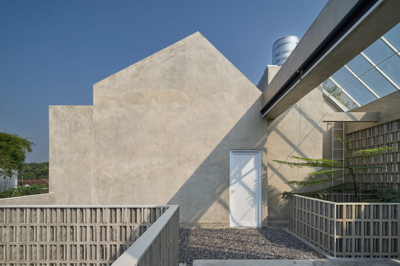 The design reinterprets the limasan, a traditional pitched-roof typology, into a contemporary form that quietly integrates with the surrounding rural context. The concrete massing is intentionally raw, monolithic, and grounded—not meant to dominate the environment but to belong to it. This groundedness is not just visual; it is spatial and social. The building opens itself up to the surrounding village atmosphere, creating a dialogue between its residents and the landscape.