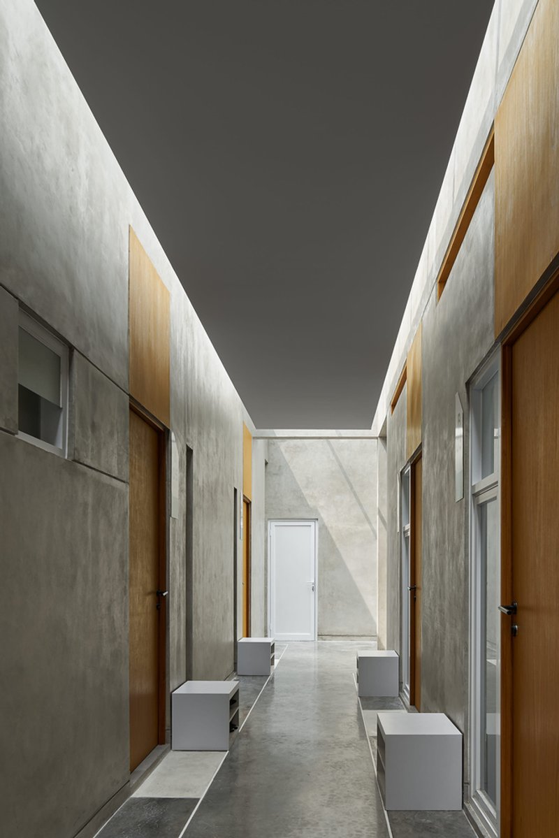 Porous Habitat's corridors are more than passageways—they are social corridors illuminated by discreet skylights hidden within gypsum coves. These bring in natural daylight without harsh heat, creating an atmosphere of gentle brightness. Each unit opens into this corridor with a semi-private threshold marked by a rain string curtain, creating a soft boundary where residents leave shoes, sit on stools, or begin casual conversations.