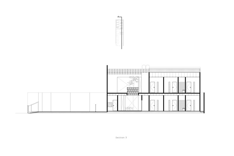 The communal ground floor is imagined as a microcosm of a rural village. Parking spaces use permeable pavers that allow grass and gravel to emerge, reflecting a soft infrastructure that accommodates nature. Shared amenities like the kitchen and dining area are positioned under the shade of trees, encouraging spontaneous social gatherings while providing respite from the tropical climate.