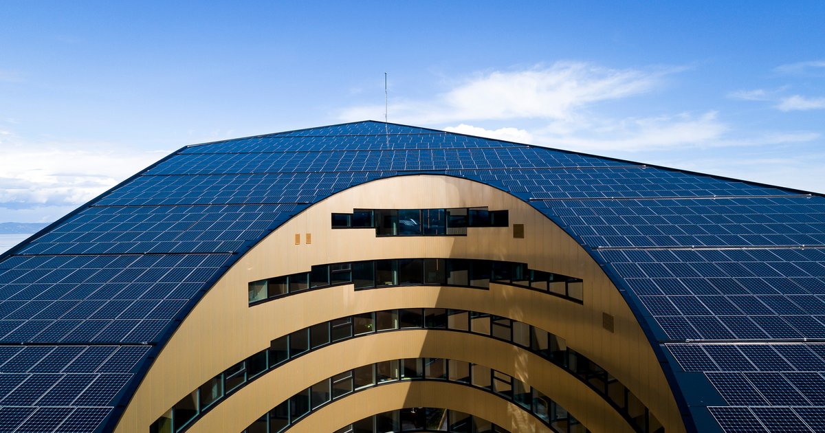 Located at 63° north of the equator, Trondheim faces extreme seasonal variations in sunlight. Snøhetta’s design tackles this challenge with a skewed pentagonal roof and 3,000 m² of solar panels strategically placed to capture maximum sunlight throughout the year. During bright summer months, surplus energy is stored to compensate for the low-light winter season, ensuring uninterrupted performance.