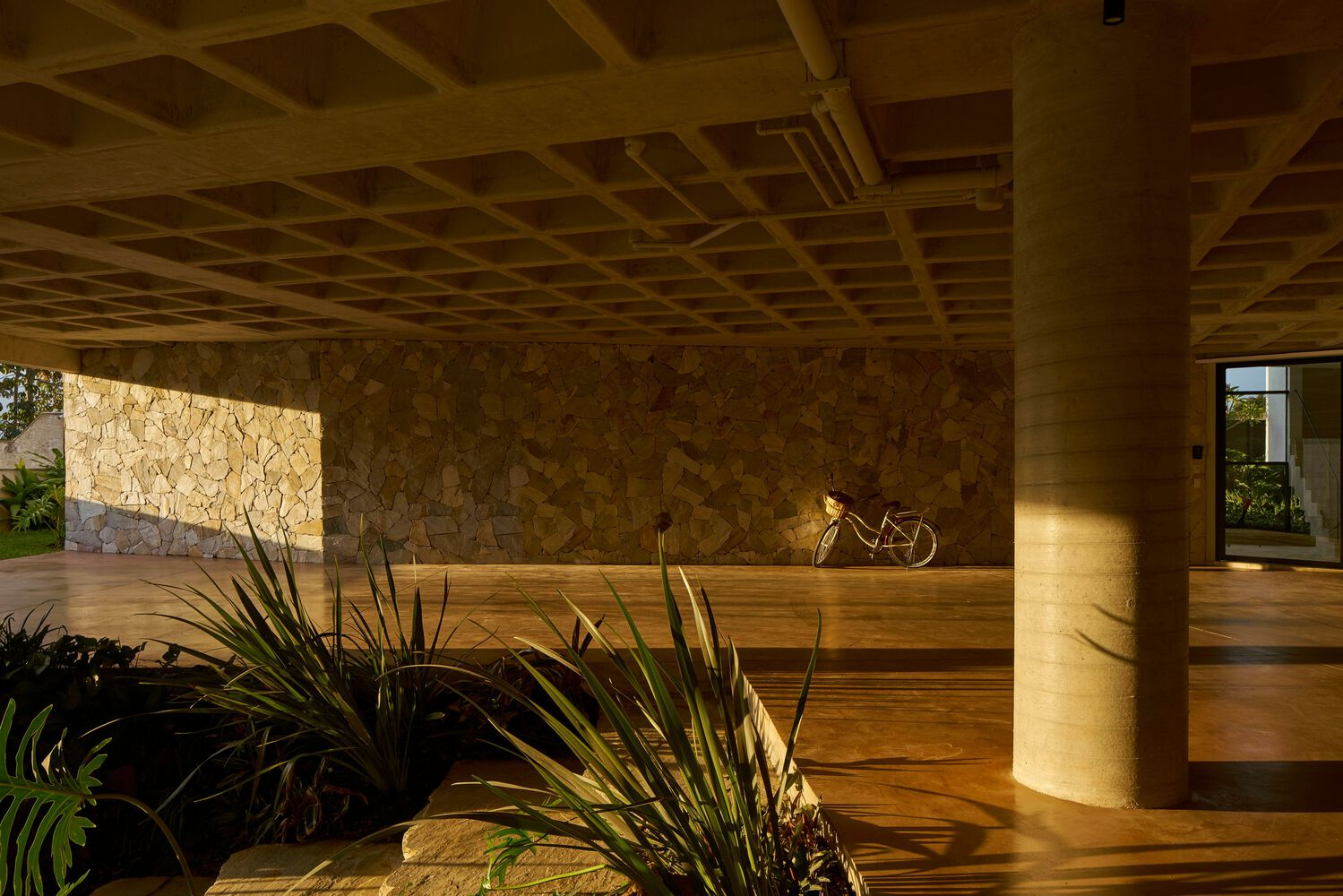 - First Floor: Slightly elevated above neighboring buildings, it houses the main access, including stairs, a ramp, and a welcoming hall. A large patio functions as both parking and a multipurpose space, surrounded by expressive landscaping that connects the house to its surroundings.
