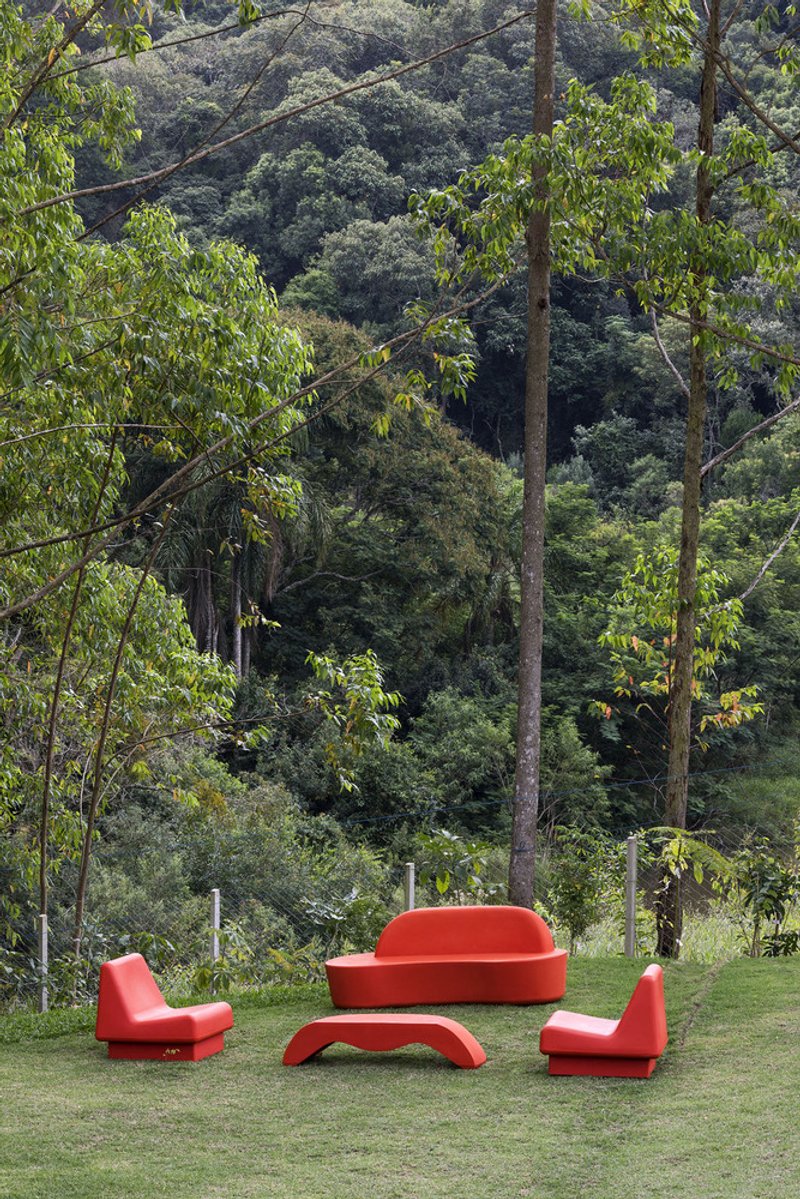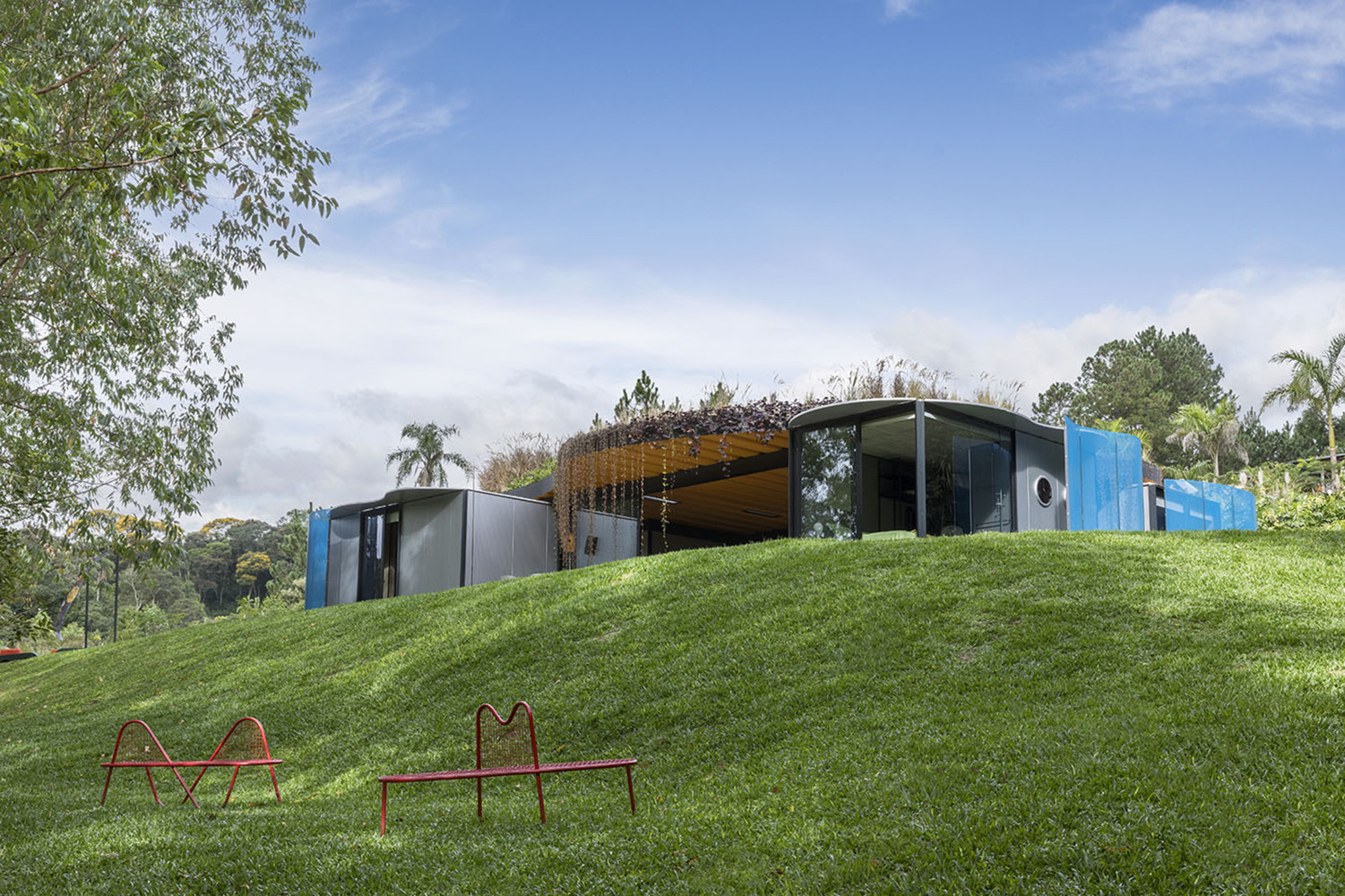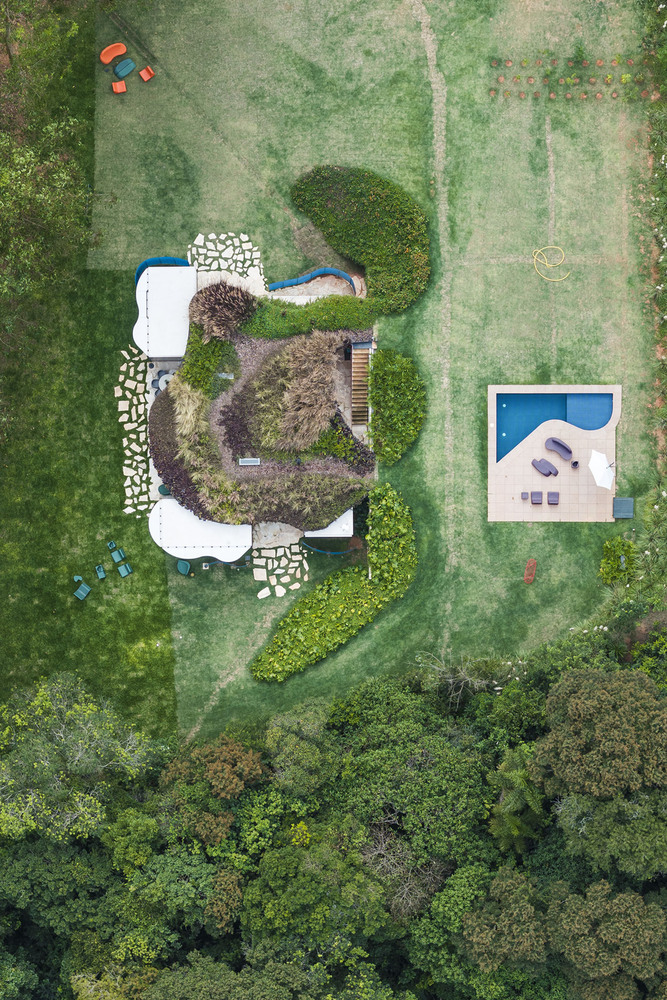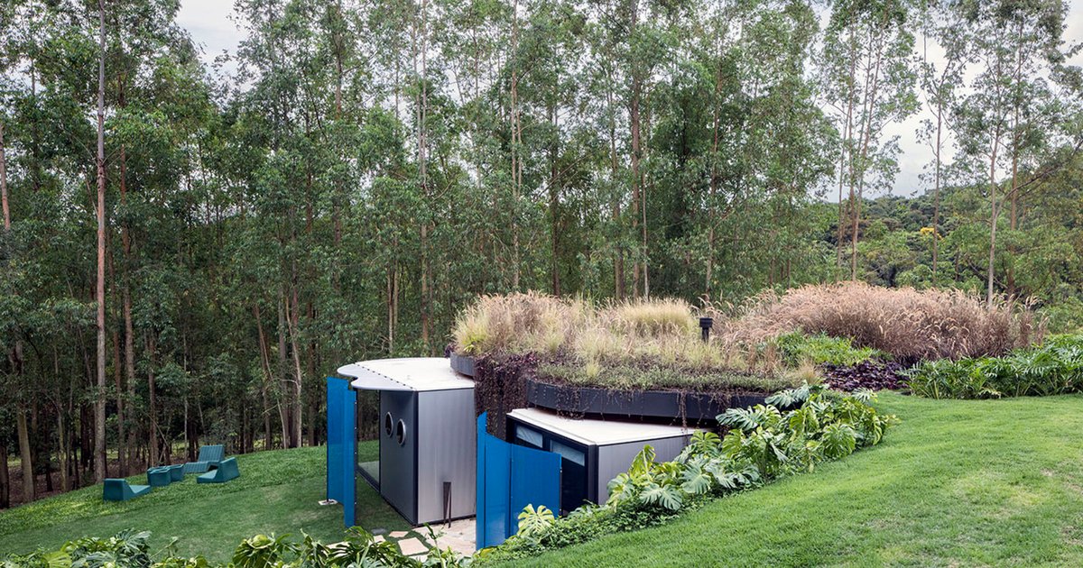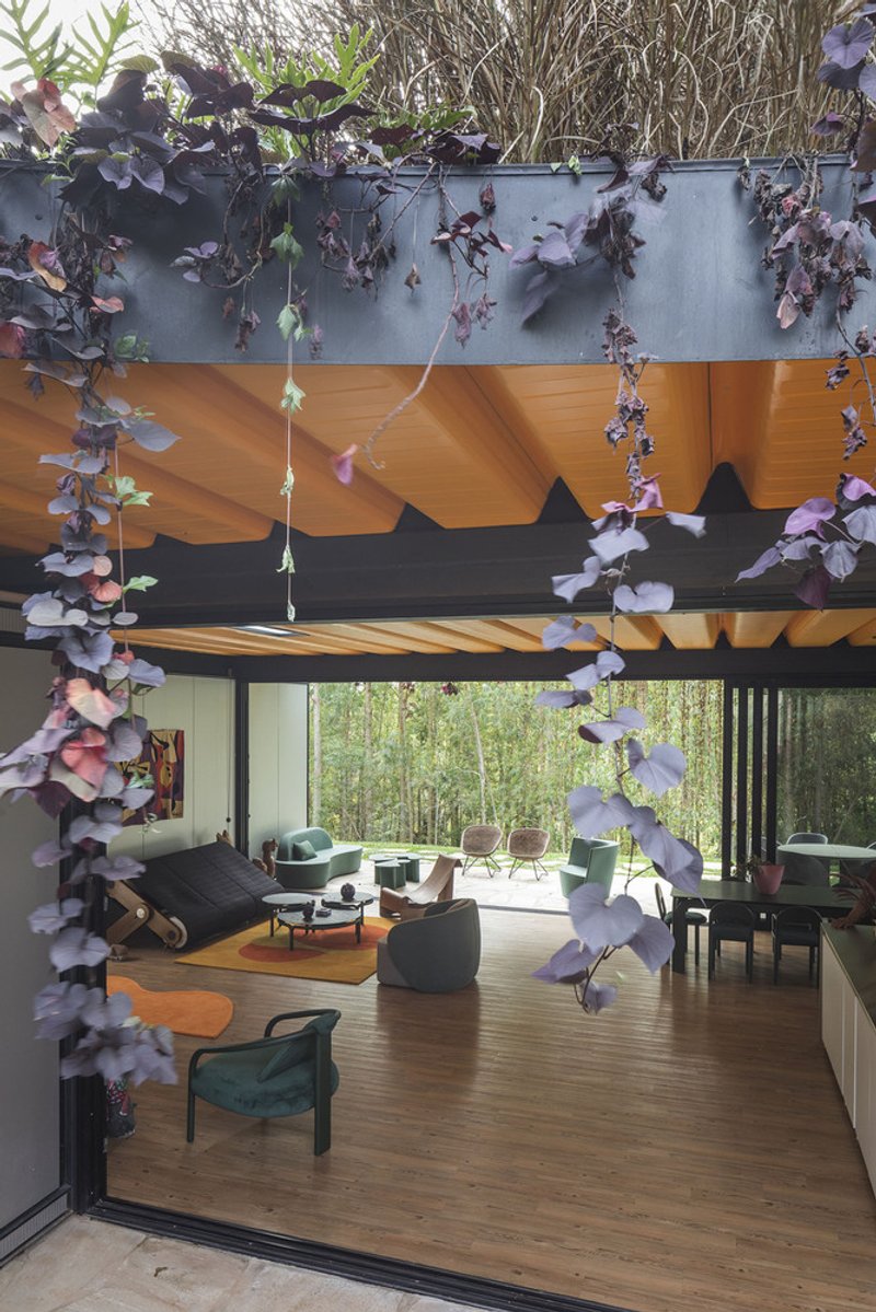 A vibrant, sustainable prefabricated modern house in Ibiúna, Brazil, designed by Rodrigo Ohtake, blending modular efficiency with bold curves.