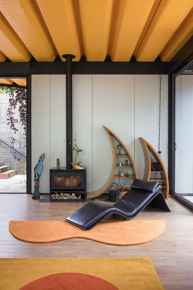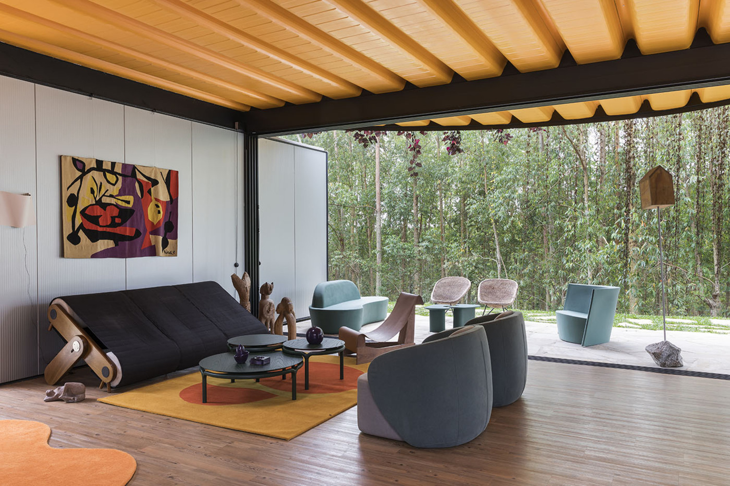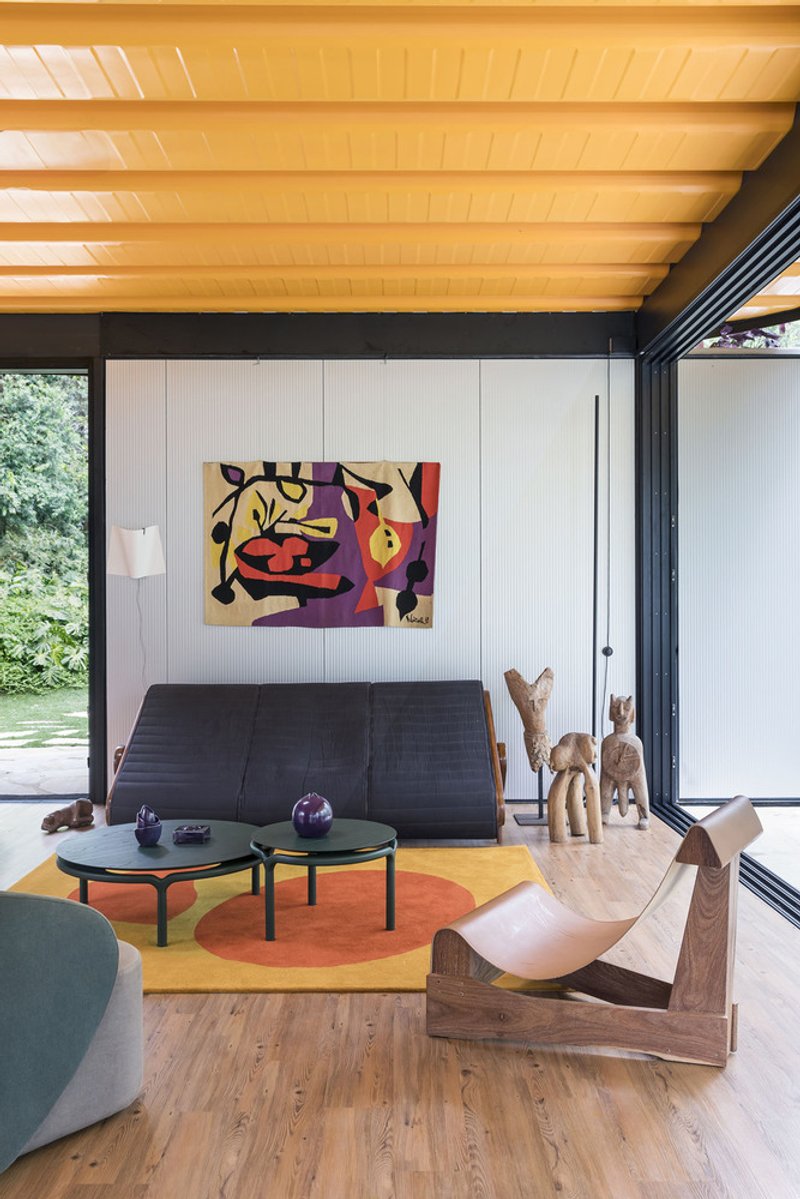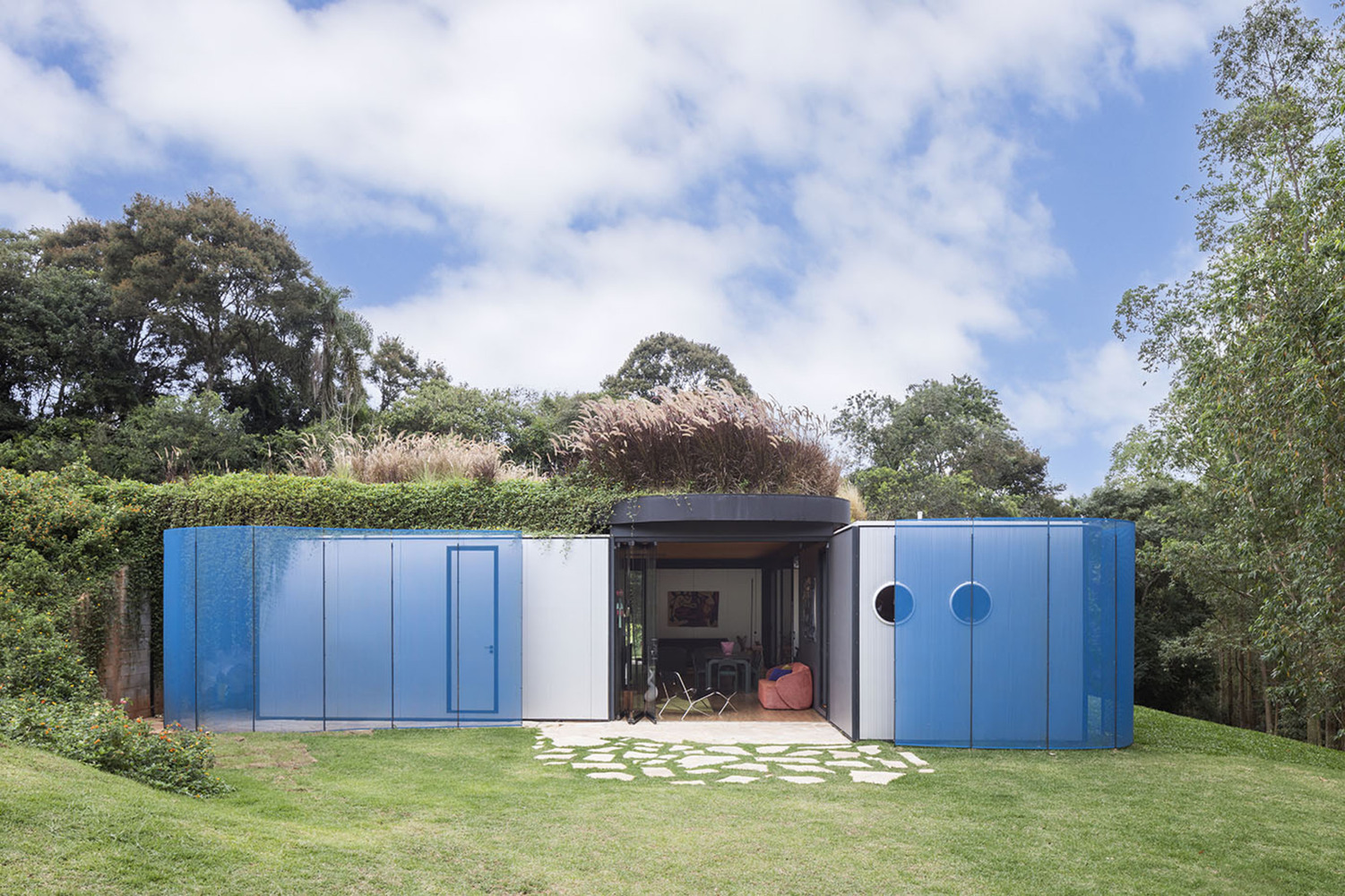 Rodrigo Ohtake’s architectural language—defined by dynamic curves and vibrant colors—is evident throughout the residence. Self-supporting roof tiles were customized to achieve sweeping curved forms, while curved walls and eaves soften the rigid modular geometry. A striking feature of the exterior is the blue perforated steel brise-soleil, adding privacy to the bedrooms while enhancing visual dynamism.