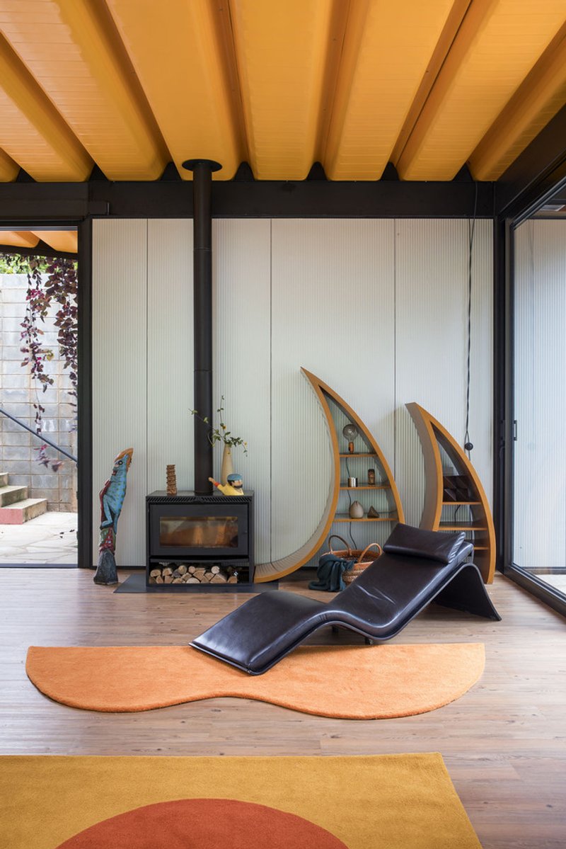 Inside, the orange-toned interiors create a vivid contrast with the lush green landscape outside. Expansive glass panels blur the boundaries between interior and exterior, immersing inhabitants in nature and eliminating the need for curtains in bedrooms. The social areas—living, dining, and kitchen—are positioned between the modular bedroom volumes, creating an open, fluid space for family gatherings.