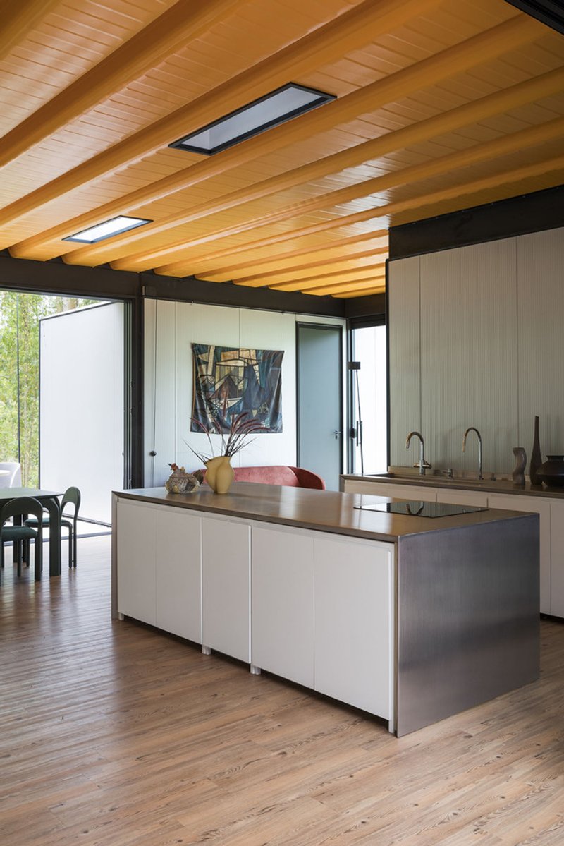 House Ibiúna was manufactured at the Syshaus factory in just 90 days and installed on-site in 30 days, demonstrating the efficiency of prefabricated systems. Built with metallic components, glass, and thermally insulated industrial panels clad in aluminum, the structure ensures durability and energy efficiency. The house rests on a plateau, fully integrated into its natural setting, and features a roof garden, further enhancing its ecological footprint.