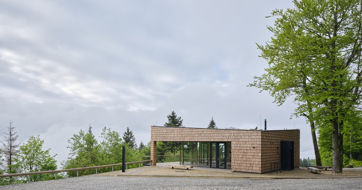 The Pustevny Gateway Center in Czechia is a wooden mountain hub with café, bell tower, parking, and sustainable visitor-friendly design.