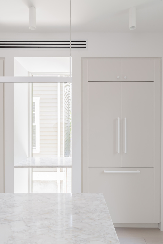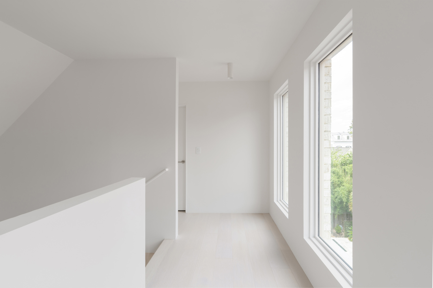 To address flood-elevation requirements without compromising the street presence, the architects recessed the entry stair into the side façade. Positioned directly beside the interior stair, this spatial move creates a compelling vertical rhythm and establishes the proportions for a four-bay window grid along the side elevation. The result is a façade composition that feels historically anchored yet distinctly contemporary.