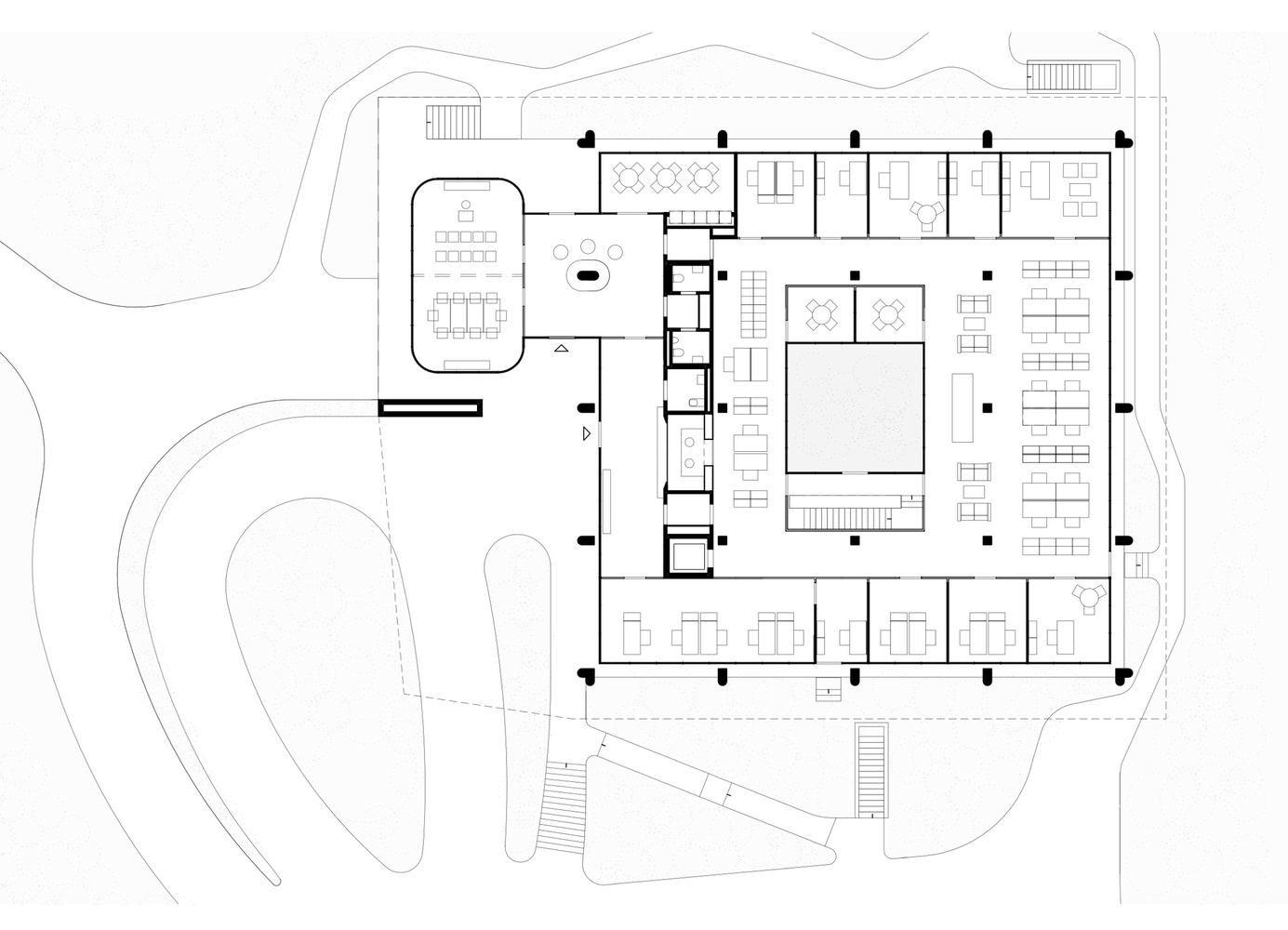 The renovation focused on optimizing the existing square structure of the building by extending the building envelope outward and adding new elements such as a striking canopy. This canopy not only marks the new conference room but also integrates the indoor and outdoor spaces effectively, emphasizing transparency and open communication which are key in diplomatic buildings.