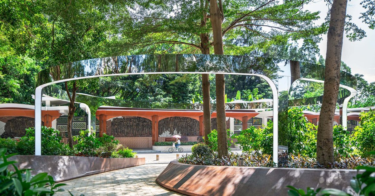 A once-neglected triangular lot at the village’s entrance was transformed into an inviting green gateway. With curved pathways, ribbon-like mirrored installations, and preserved tree canopies, the park now forms a seamless transition between urban activity and community calm. The design references “Turtle Back Stone” through undulating forms that create moments of pause and reflection.