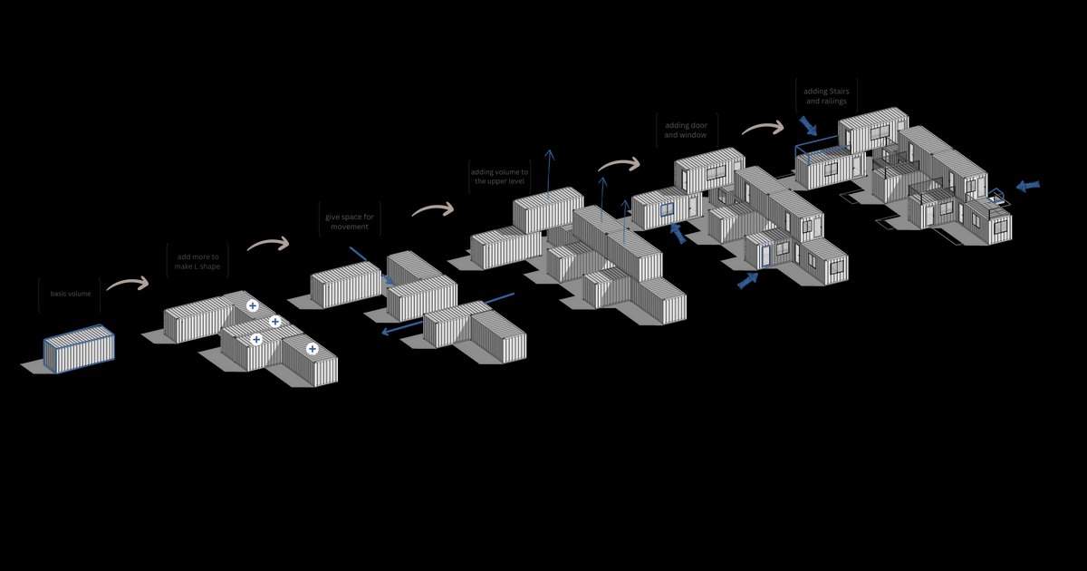 After choosing the container as the main module of the work, we started to examine the structural analysis and the potential of combining the containers together, and among several alternatives, the option that has both the combination of open and semi-open spaces and the favorable light from the north and the south reaches all the modules.