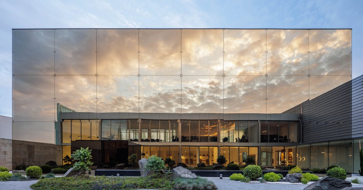 This integration of landscape and architecture reinforces the project’s focus on well-being, daylighting, and environmental awareness—key considerations for contemporary office and industrial design.