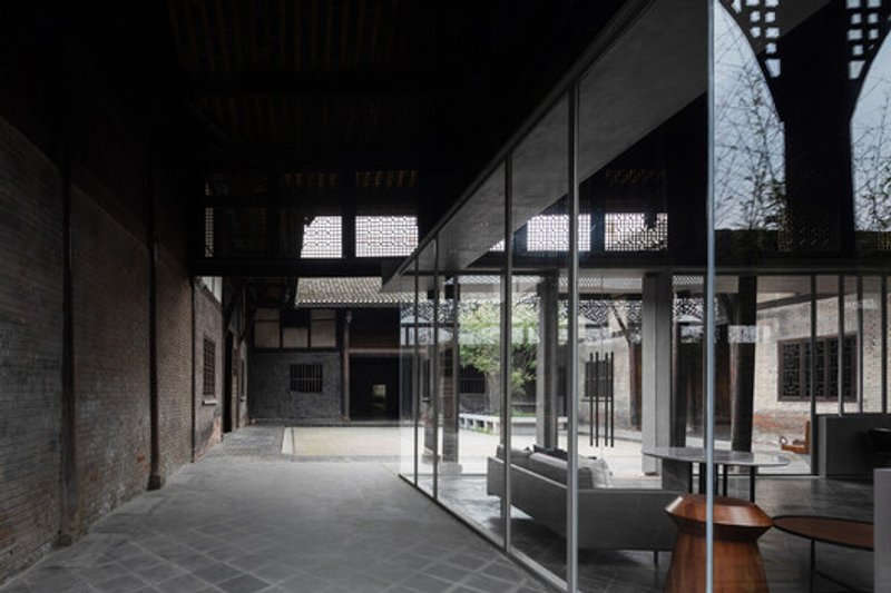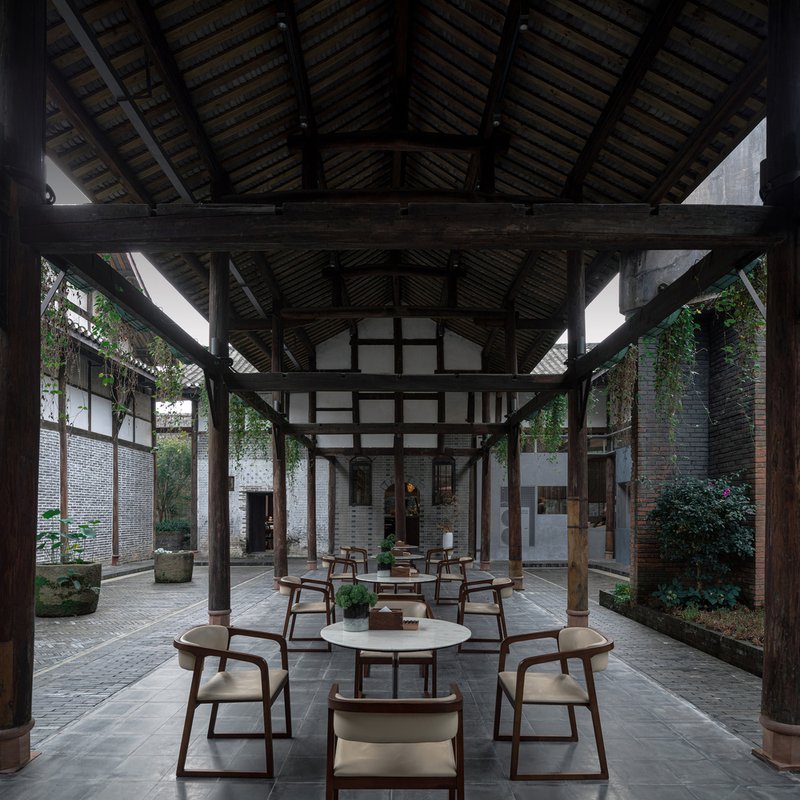 The first courtyard serves as an exhibition of Liao Wei Mansion’s restored architecture and other heritage buildings of Anren. Visitors immediately encounter local craftsmanship, historic timber structures, and cultural narratives. A lightweight timber enclosure frames rest areas inside and outside the building.