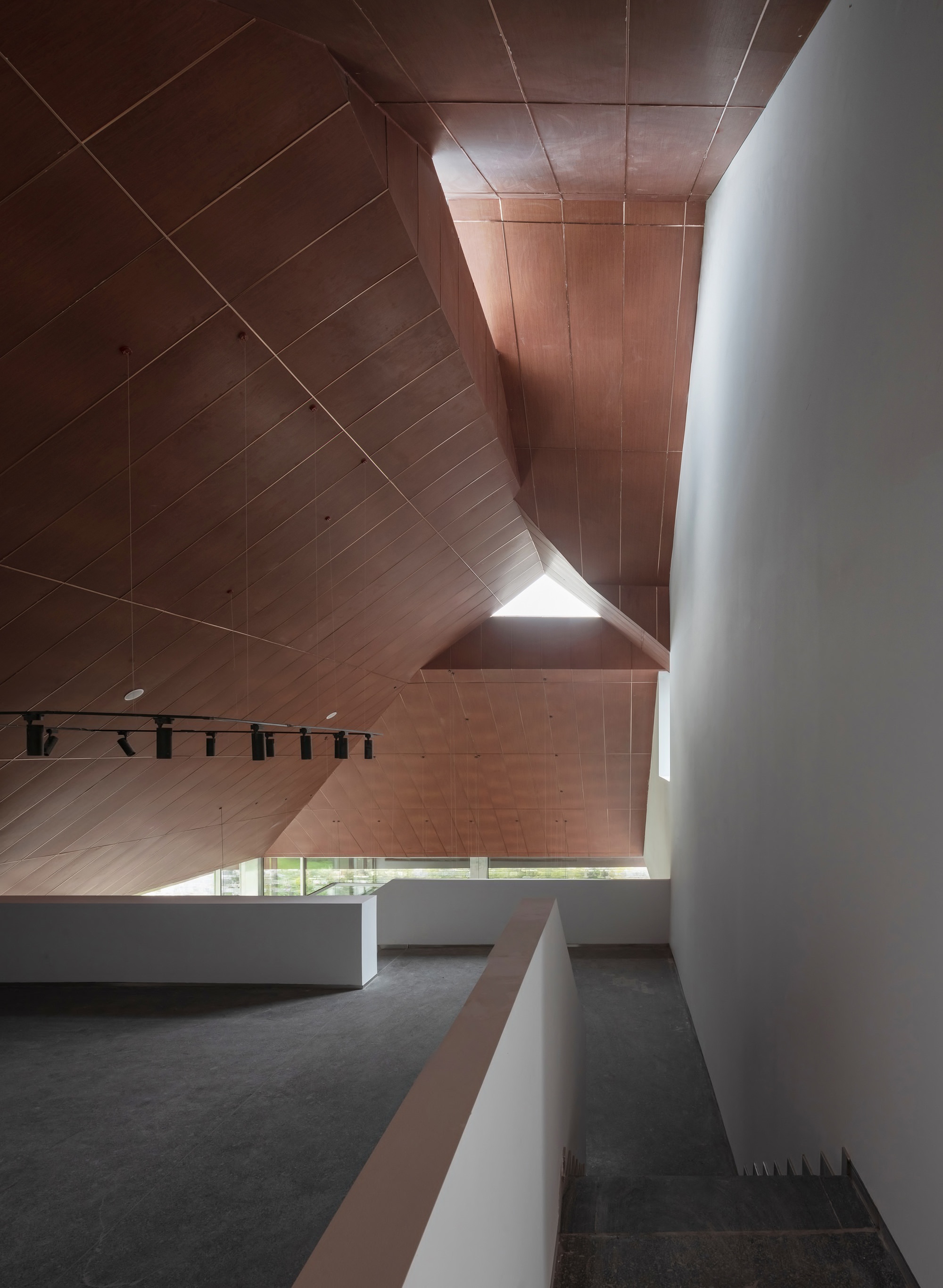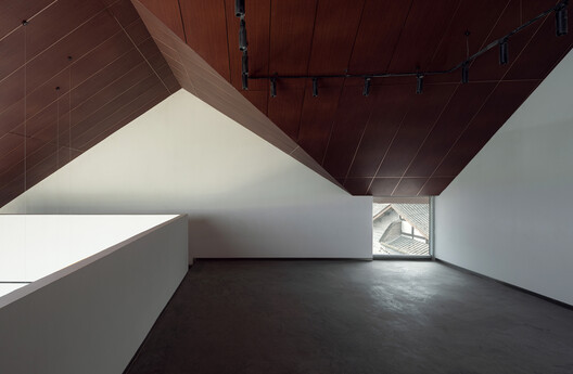 Under the multi-level pitched roof, diverse programs unfold across varying volumes. As visitors ascend the internal circulation path: