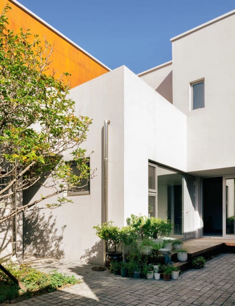 The stepped building form introduces terraces for upper-level bedrooms, while raised courtyard walls maintain visual separation from neighboring plots. Carefully positioned entrances further distinguish residential, office, and workshop functions, allowing independent or combined use as required.