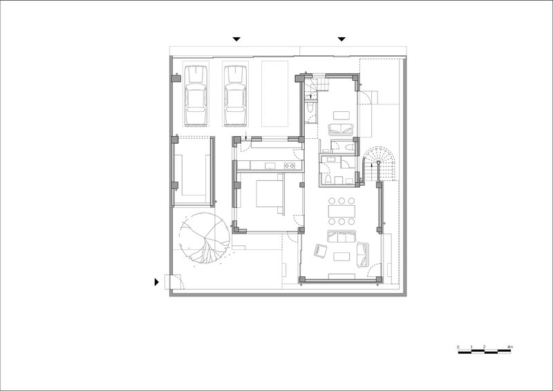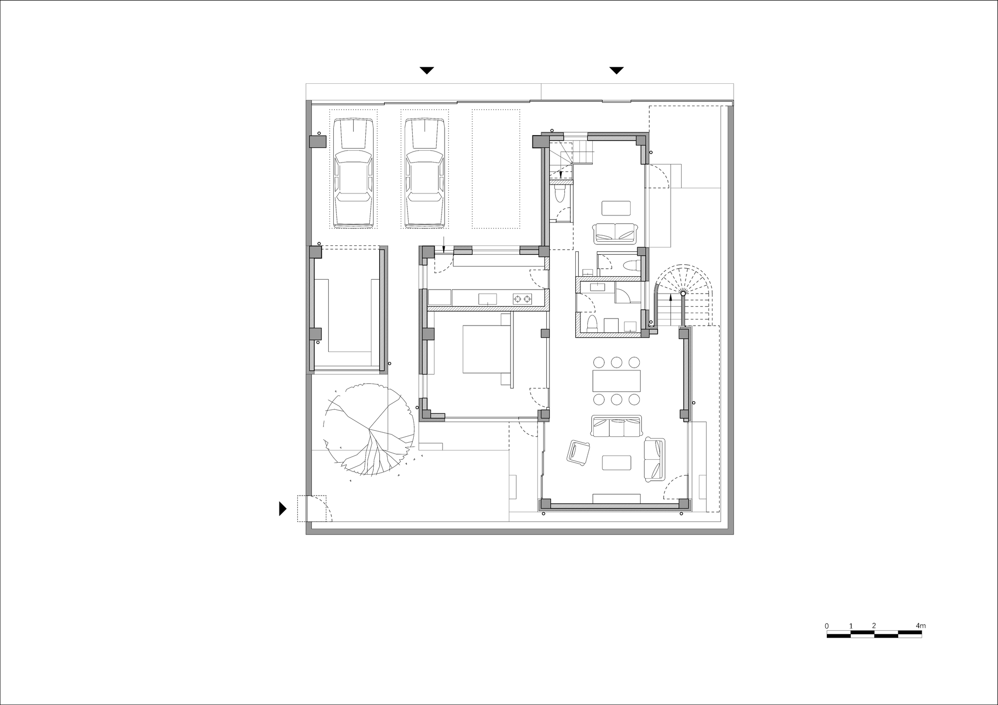 The ground floor functions as a fluid public zone, seamlessly connecting indoor spaces with the courtyard. Initially designed as a living area, it now operates as an exhibition and display space, reflecting the homeowner’s evolving professional focus.