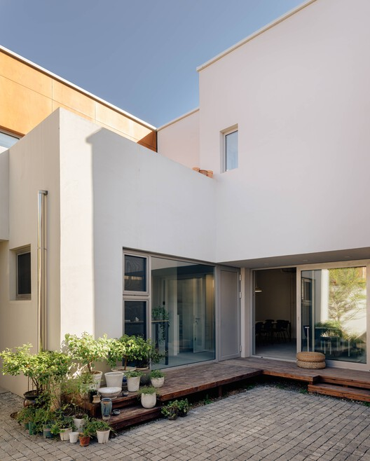 Challenging traditional rural housing models where buildings surround a central courtyard, the architects concentrated the building at the center of the plot, allowing a sequence of courtyards, terraces, and rooftop platforms to wrap around it. This strategy ensures that every room has direct access to outdoor space, supporting gardening, daylight, cross-ventilation, and privacy.