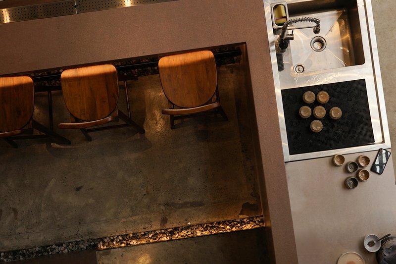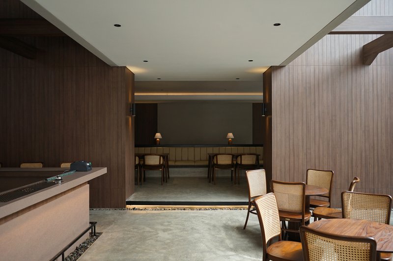 Circolo’s interior combines natural elements like wood with modern materials such as glass and textured beige walls. Wooden accents on structural pillars and beams, along with strategic mirror placements, amplify the space's natural ambiance and visual depth. These elements collectively foster a warm and welcoming atmosphere for diners.