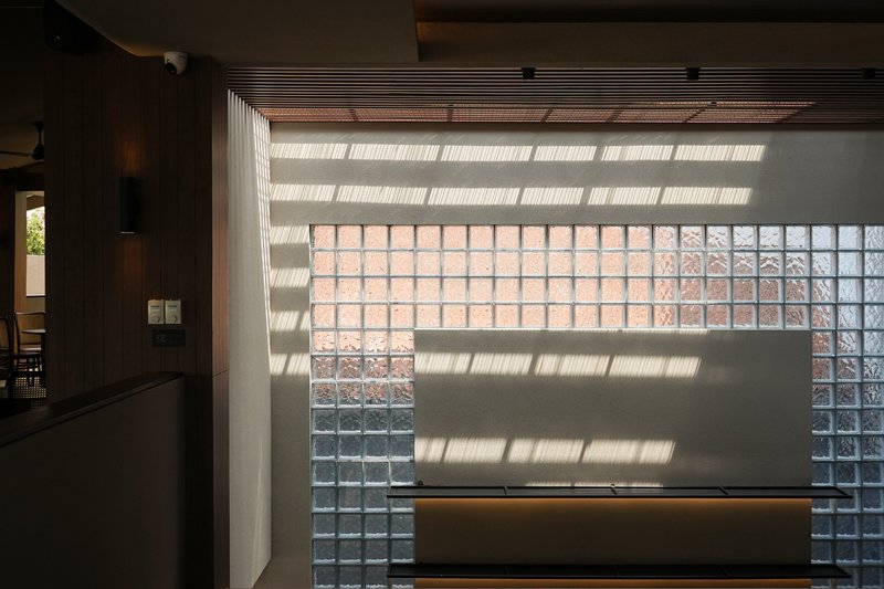 The entrance of the restaurant features wide, long corridors that introduce guests to a spacious environment, enriched with natural sunlight filtered through side curtains. This setup creates captivating light and shadow plays, leading visitors towards the heart of the restaurant. The centerpiece is a two-story bar area with a glass block wall that radiates as a visual focal point visible from various angles within the space.