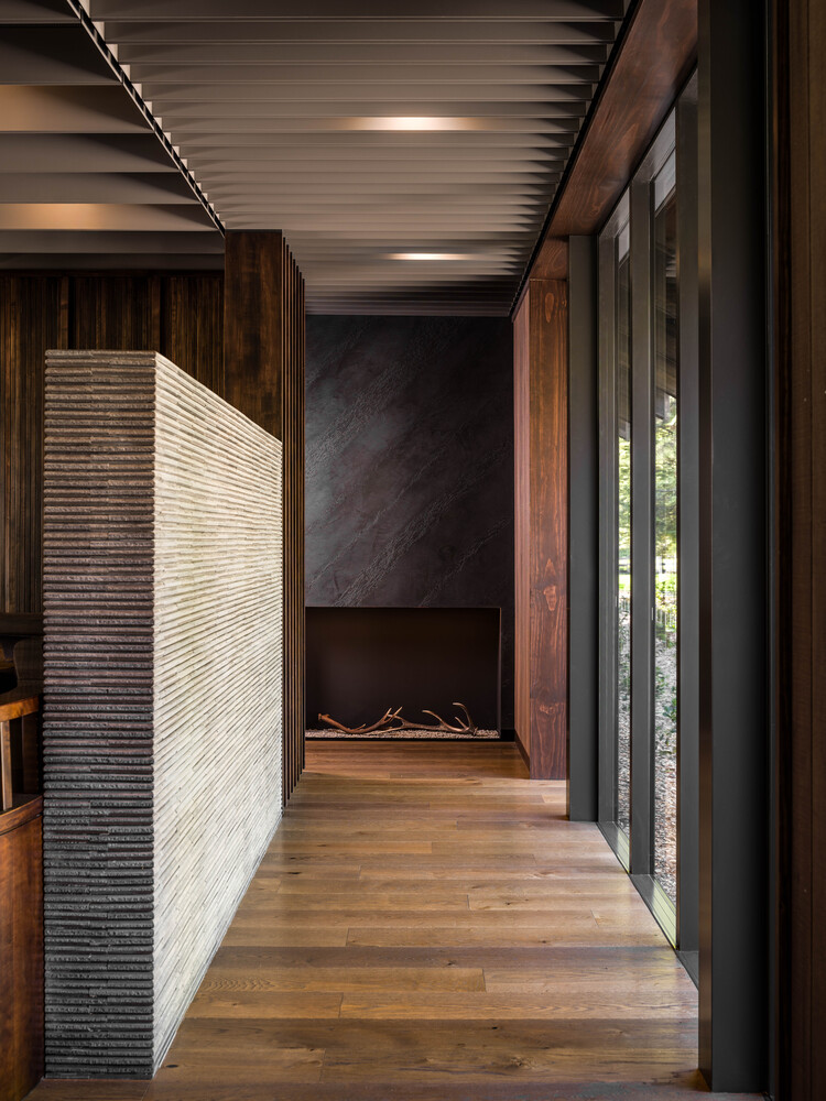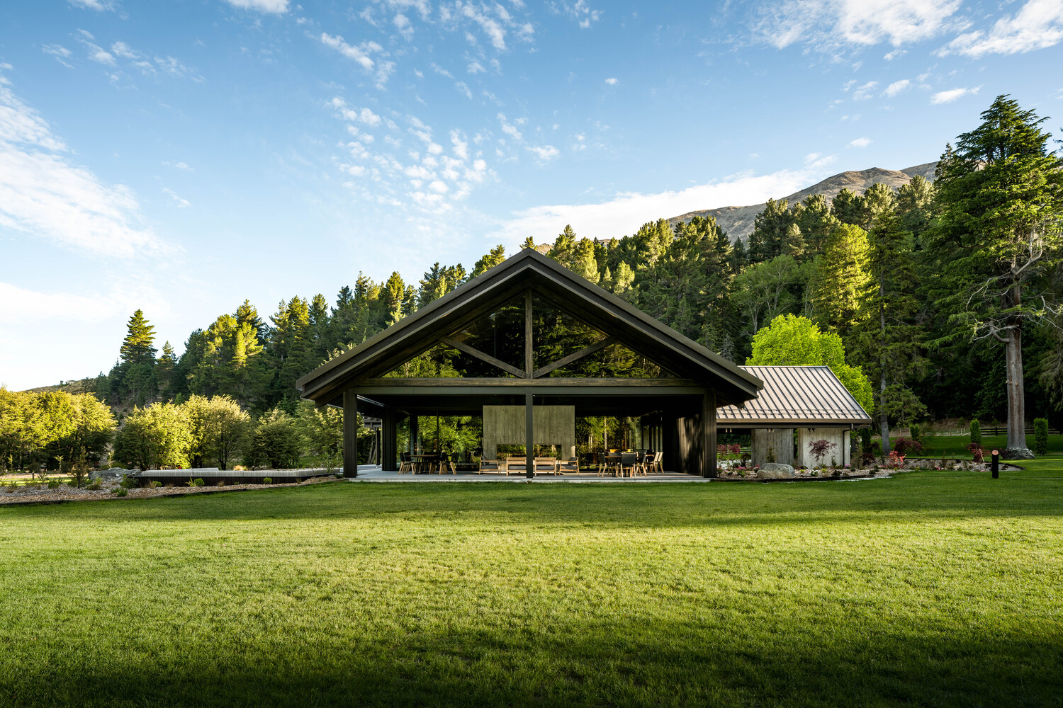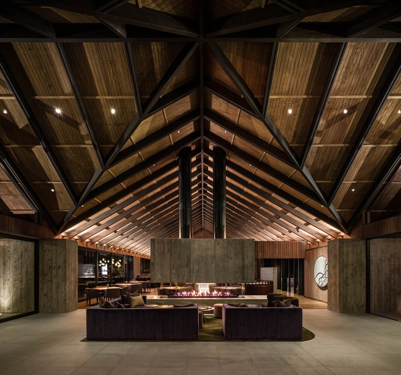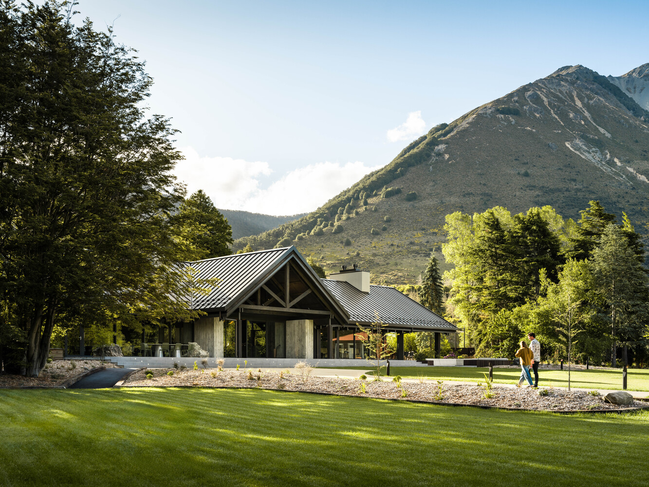 Positioned deliberately within the remote landscape near Lake Pearson, Sugarloaf offers panoramic views of the surrounding alpine environment. Its form avoids dominance over the terrain, instead drawing the eye to the landscape. Guests are greeted by a grand porte-cochère leading to oversized copper doors—an elegant prelude to the warm, cathedral-like interior that unfolds within.