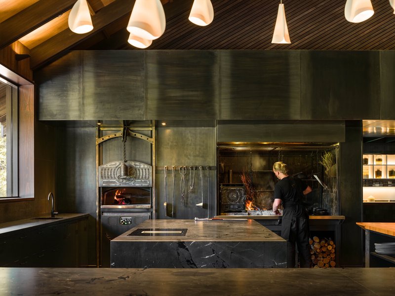 Stone elements ground the material composition: bluestone tiles line the floors, and natural stone slabs shape the countertops, echoing the region’s braided rivers. These finishes are chosen not only for their visual depth and resilience but also for how they will patina over time, aging gracefully within this highland context.