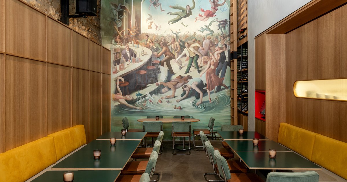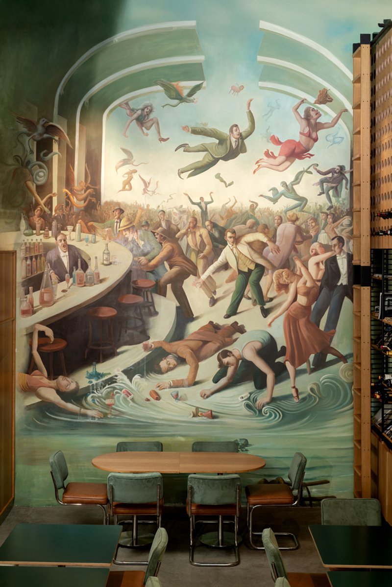 Even before entering, the visual identity of Father & Bun asserts itself with a dramatic double-height mural visible through the facade. Painted using traditional church techniques, the artwork depicts a surreal, indulgent party — a tongue-in-cheek fusion of sacred and profane, art and appetite. This mural encapsulates the project’s ethos: storytelling through architecture, art, and cultural references.