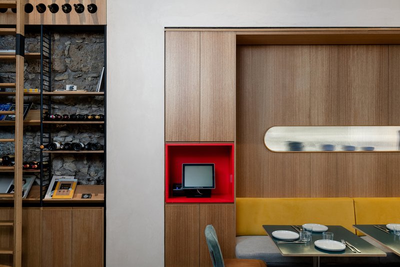 The restaurant's unique sunken positioning below the sidewalk level informed the spatial choreography. A descending staircase welcomes guests into the space, guiding them toward a sculptural bar — built in steel, clad in vertical wood, and topped with a green counter aligned to street height. This element acts as both a centerpiece and a functional threshold, blending art and utility.