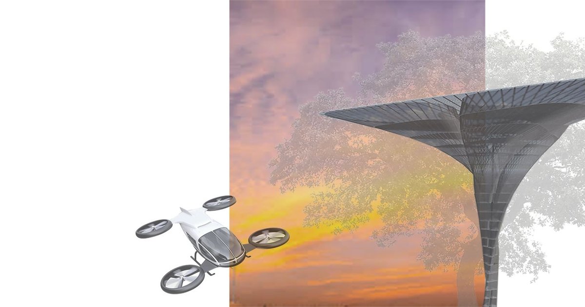 The imagery presents futuristic flying vehicles surrounding the structure—symbolizing a future in which vertical hubs become mobility anchors. The high altitude makes the tower an ideal landing and take‑off point for next‑generation aerial transport systems.