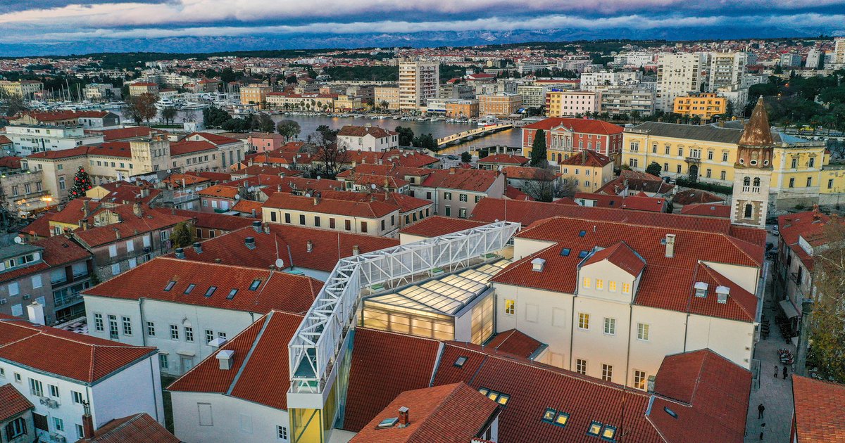 Visitors can ascend to the highest levels of the glass corridor, where the city of Zadar unfolds as part of the exhibition. From these elevated vantage points, the interplay of red rooftops, historic stone facades, and the blue Dalmatian sky enhances the cultural experience, merging the cityscape with the museum-like interior.