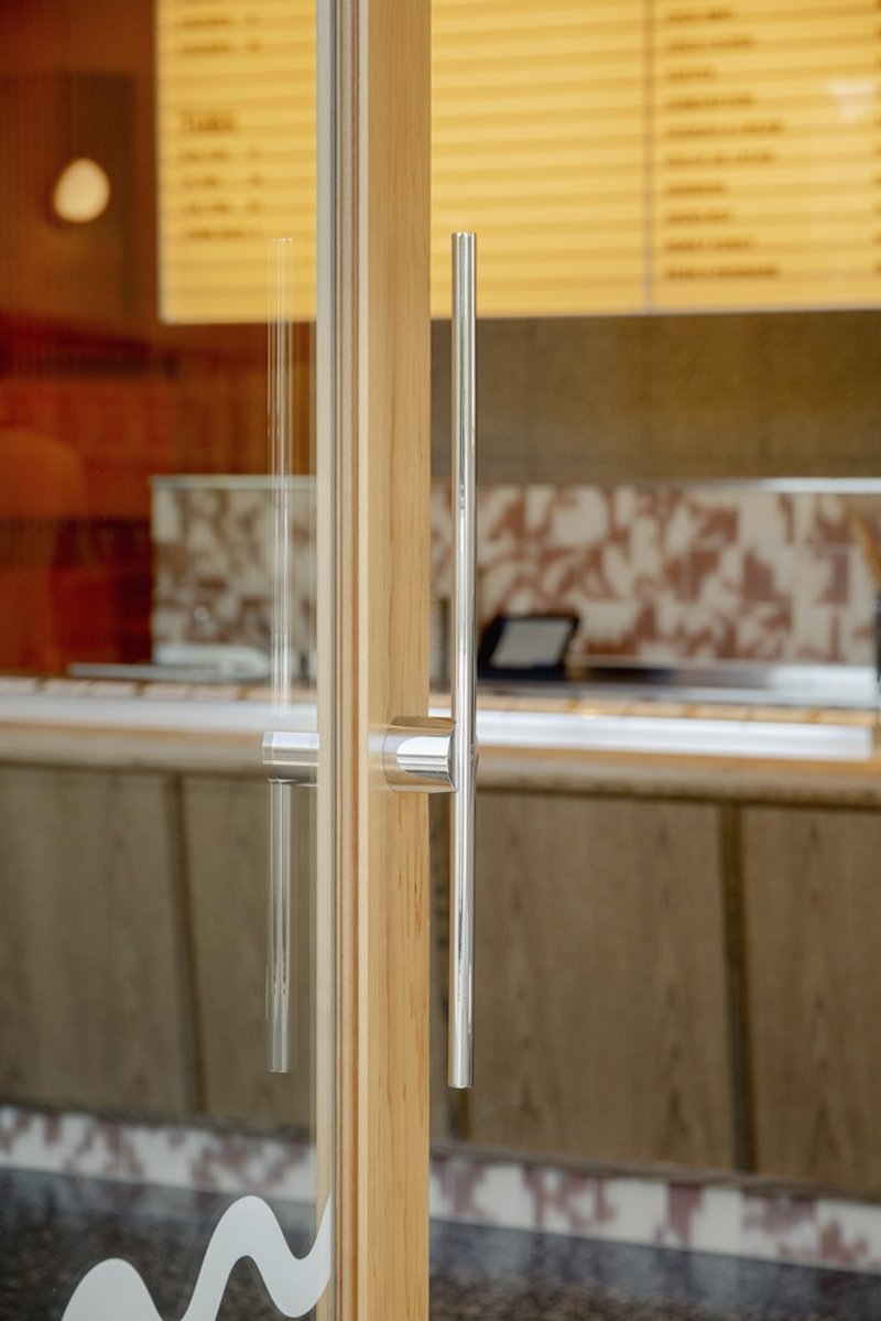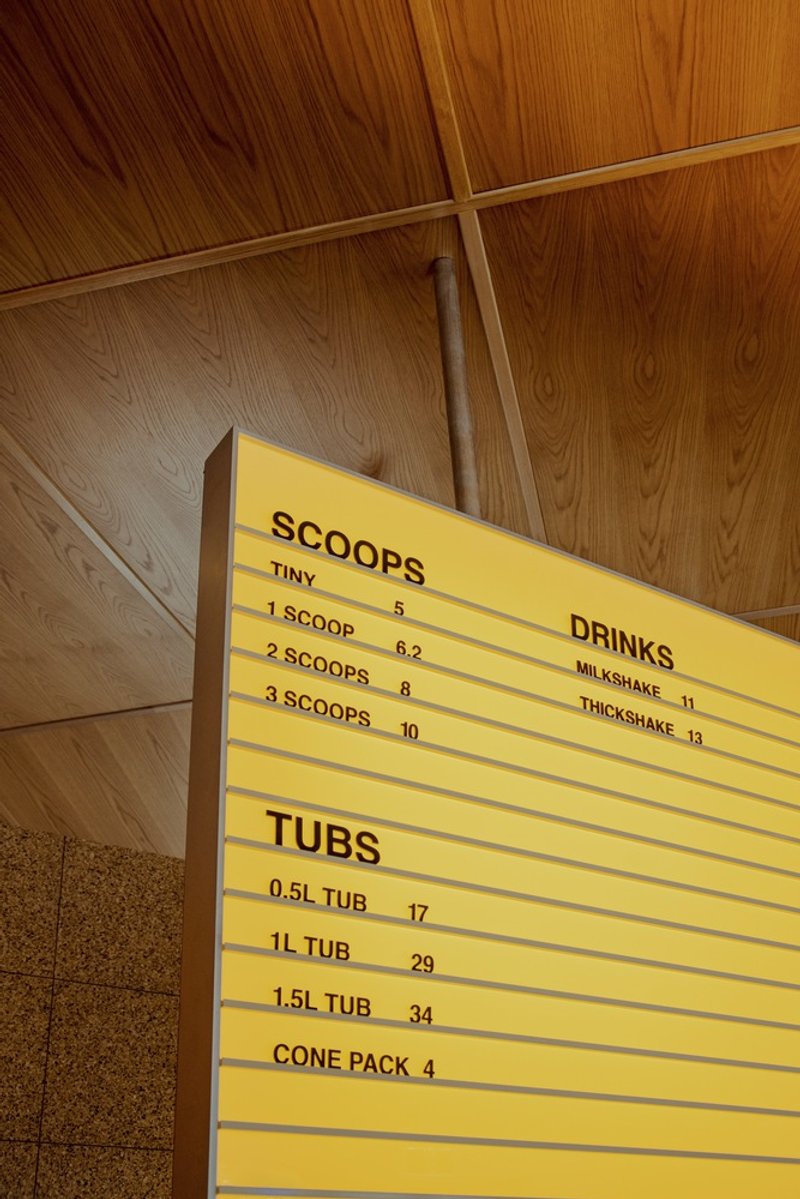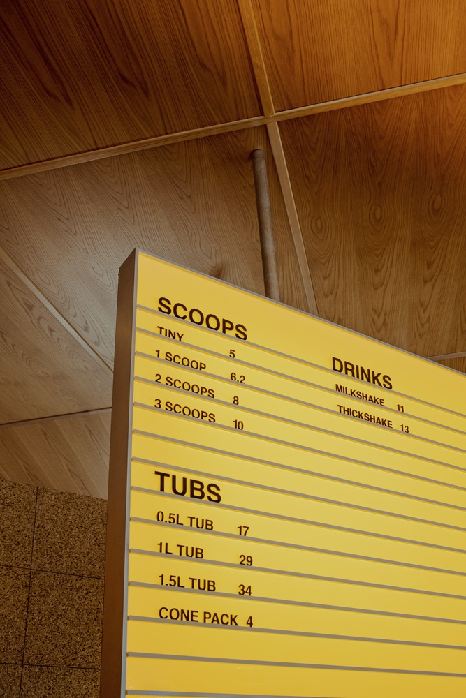 Positioned on an obtuse corner site, the design capitalizes on the old workshop's existing openings. Large timber windows illuminate the interior with natural light, creating an inviting atmosphere that extends a visual connection to the street. This strategic use of windows enhances the retro-inspired gelateria design, offering patrons a bright and welcoming environment.