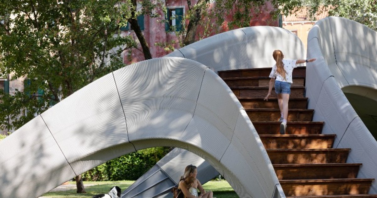 The footbridge was exhibited at the Giardini della Marinaressa during the Venice Architecture Biennale until November 2021. Striatus provides a glimpse into the future of construction, where advanced technology and traditional techniques can work together to build more with less.