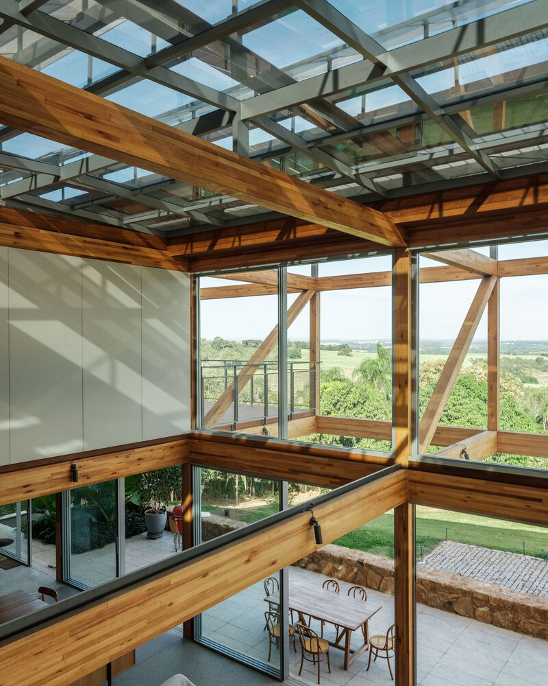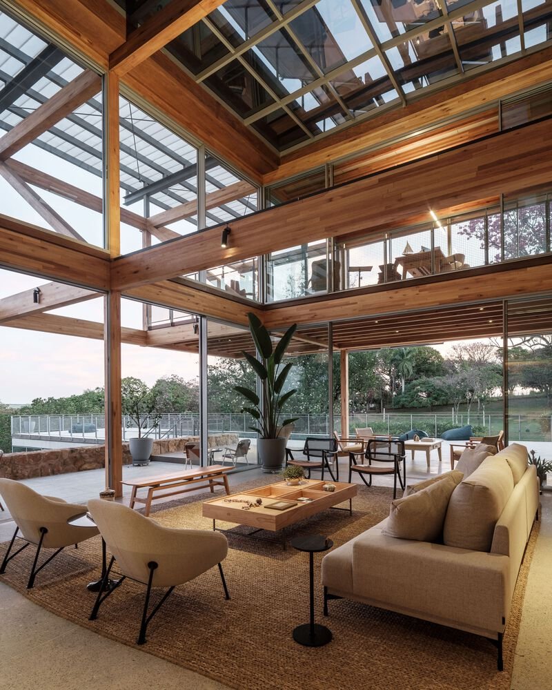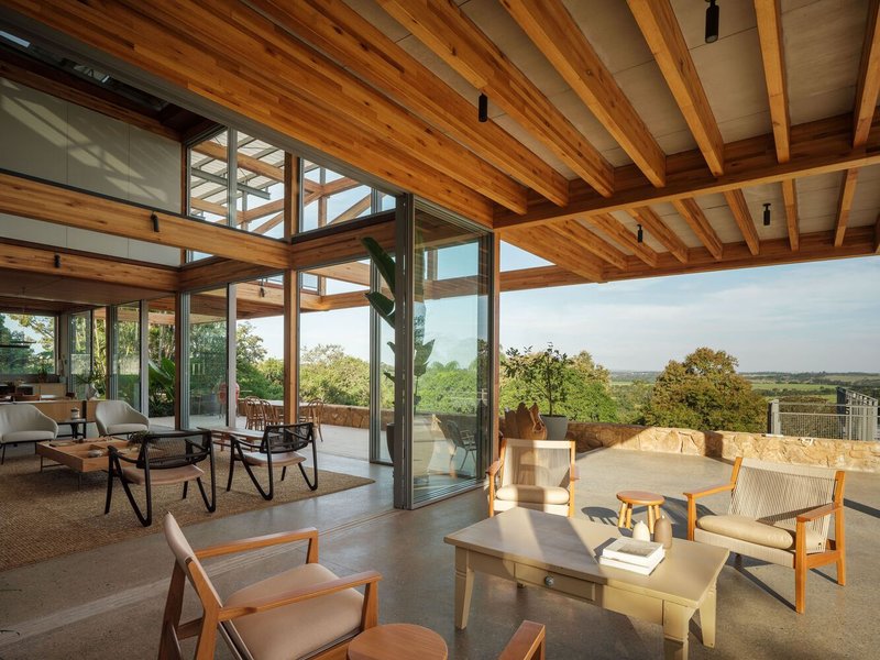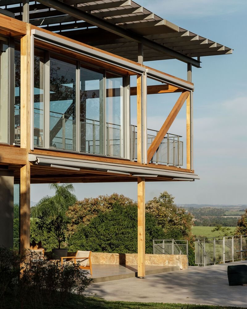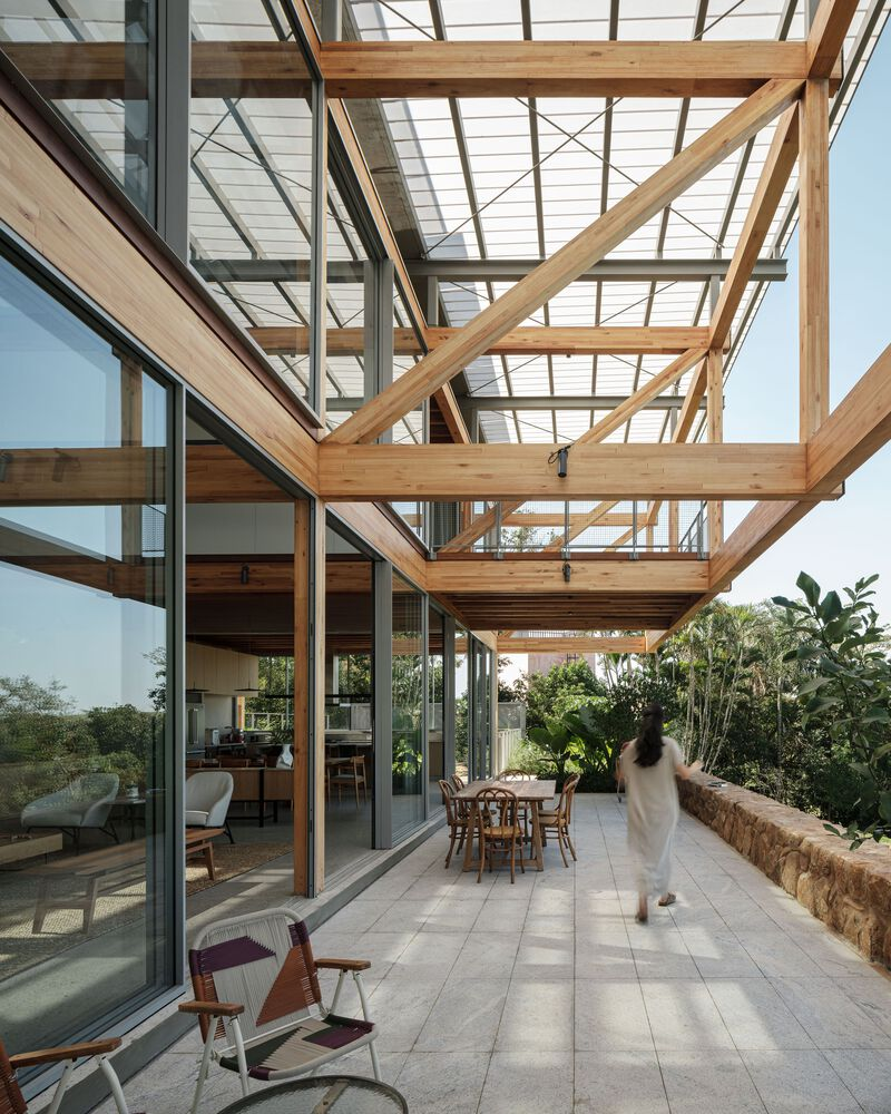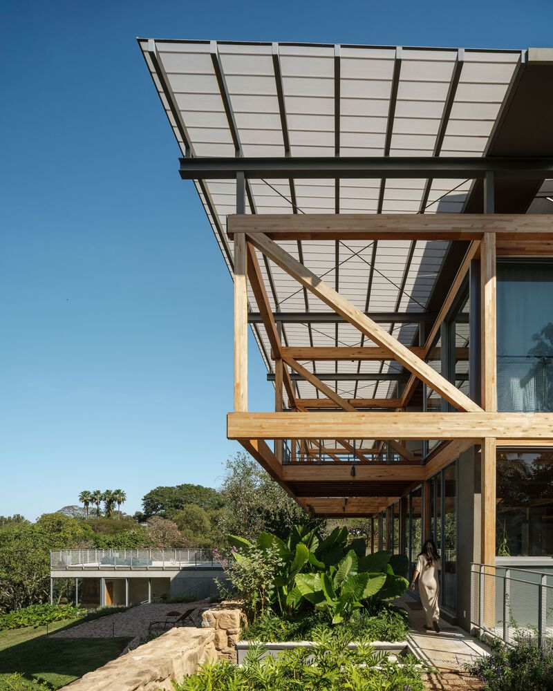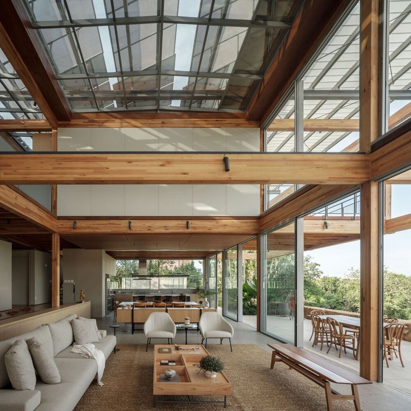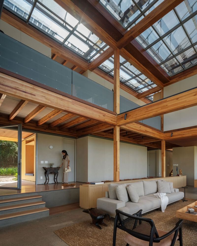 One of the standout features of RF Residence is its structural grid, constructed with glued laminated timber (GLT). This material not only provides structural integrity but also enhances the visual warmth and texture of the home. The GLT grid supports the central living area and extends into cantilevered sections to the north and south, housing the bedrooms, office, and suspended terraces.