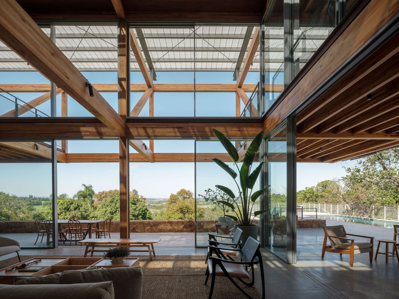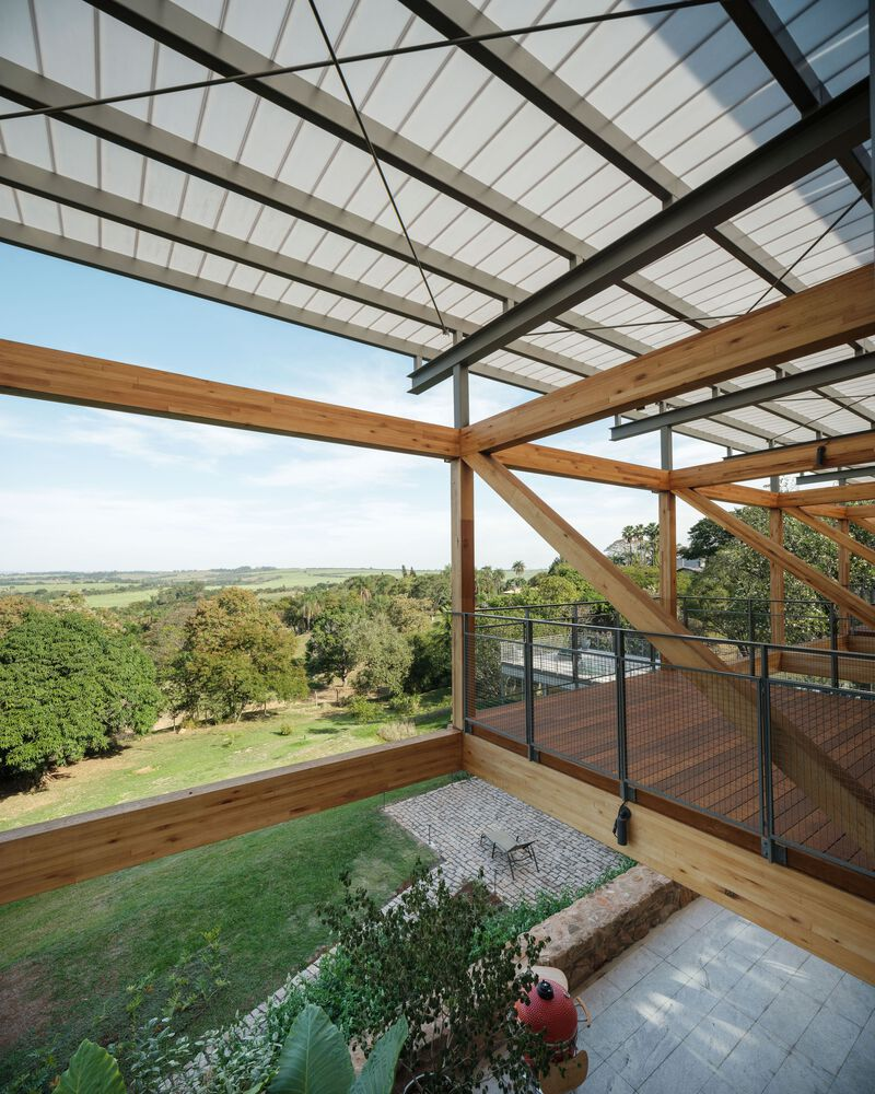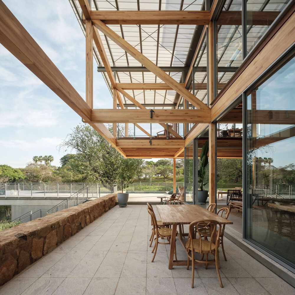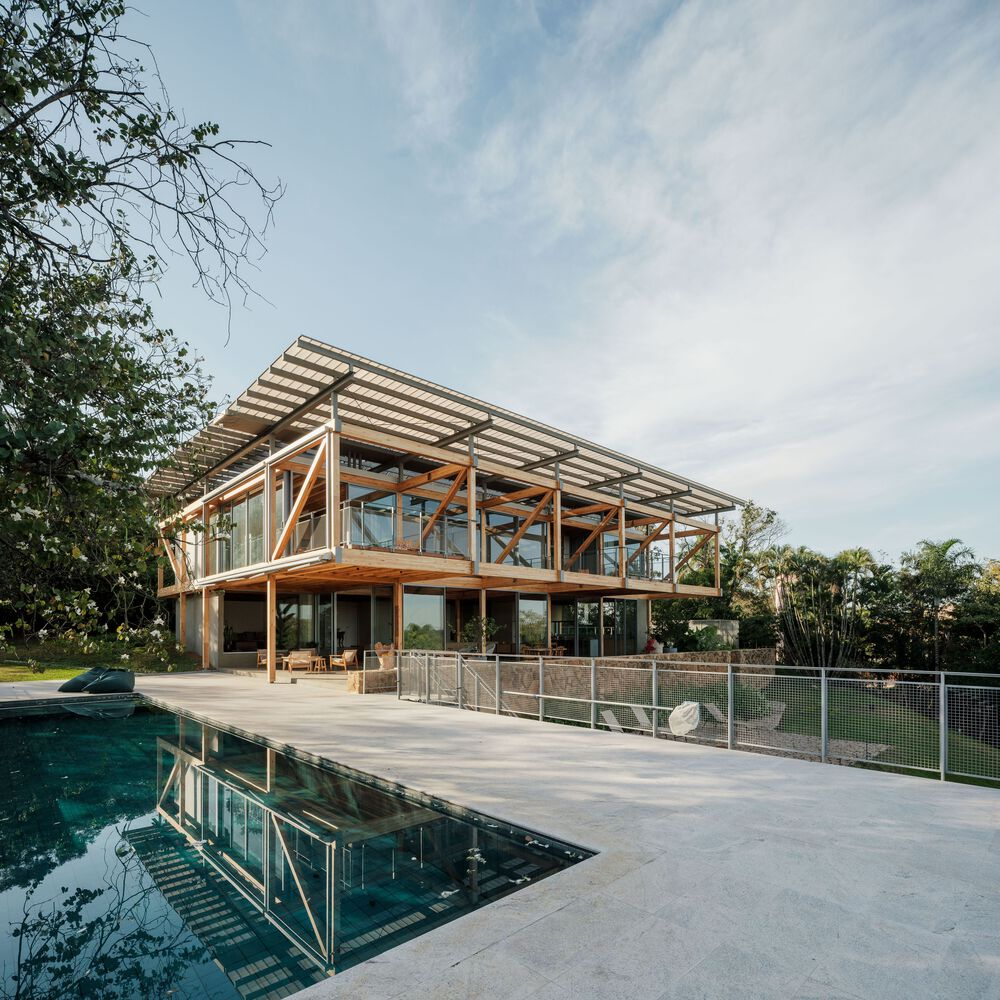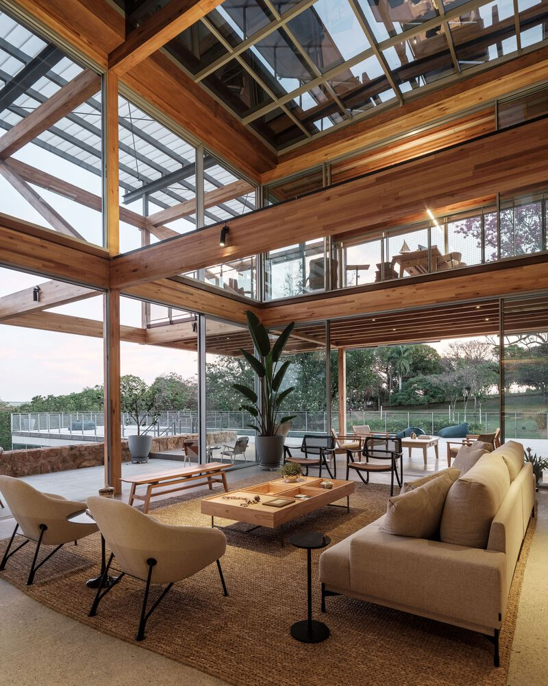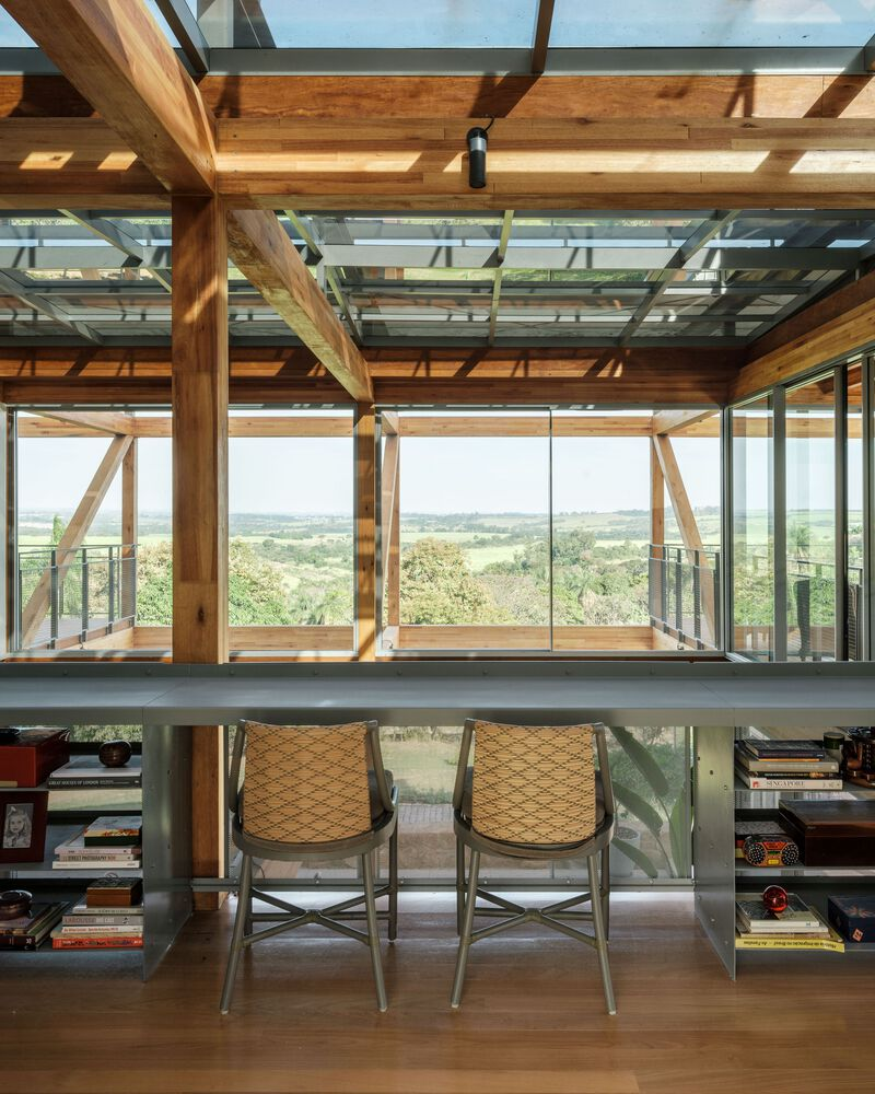 One of the standout features of RF Residence is its structural grid, constructed with glued laminated timber (GLT). This material not only provides structural integrity but also enhances the visual warmth and texture of the home. The GLT grid supports the central living area and extends into cantilevered sections to the north and south, housing the bedrooms, office, and suspended terraces.
